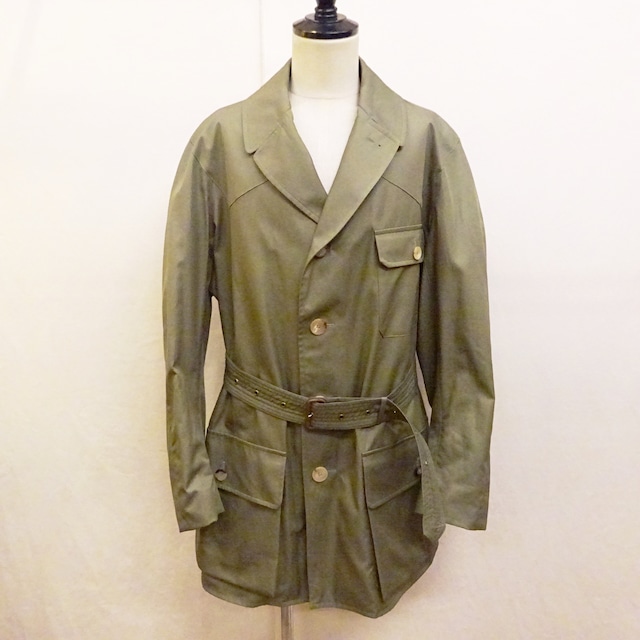 <SHOOTER-GRENFELL CLOTH> 1890年創業の英国屈指のアウター専業メーカー GRENFELLより、秋から春までの幅広いシーズンにて良き相棒になってくれる、Shooter(シューター)と名付けられた狩猟用のシューティングジャケットのご紹介です。 同ブランドの定番として1940年代から存在するシューターは、製造上いくつかの変更はあるものの大きな変更は無く、グレンフェルの中でもクラシックな歴史と共に深みを感じさせてくれる定番アイテム。 本格的なシューティング用として実用性の高いガンパッチ、ウエストベルト、マチ付きのビックポケット、ハーフコートに近い着丈の長さなど、リアルで武骨な男心をくすぐるディテールが魅力の1枚です。 ミドル丈に設定された着丈はインナーのジャケットやニットなどの守ってくれる仕様、袖口はスナップボタン付きのリブが隠れており、インナーとの干渉によってボタンを外したりと使い分けて頂けます。脇下には3つの通気口であるベンチレーションが施されており、裏地はグレイジュのコットンクロスを採用し内ポケットは1つ付いています。 肩幅や身幅は猟銃を打つ姿勢に負担がかからないよう可動域が広めにとられているので、ジャケットからニット、スウェットなど幅広いスタイリングを楽しめるのも魅力の1つです。 防風・防水性に優れて透湿性も備え、過去には英国軍でも採用された歴史を持つ非常に耐久性の高いグレンフェルクロスを使用しており、身体に馴染んでいく過程を楽しみながら感じ取れる経年変化は同生地でしか味わえないものがあります。 非常に着心地が良く、気軽に何も考えずに羽織ることができ、クラシカルなデザインながらラグジュアリーな雰囲気、機能的な素材で季節関係なく重宝する逸品は、選んで頂いて間違いのないジャケットです。是非この機会にお試しください。 <GRENFELL/グレンフェル> 英国で1890年に創業の名門コートブランド。ブランド名の由来は英国の有名な探検家ウィルフレッド・グレンフェル卿が極地に赴く際、防風・防水性に優れて透湿性も備えた生地の製作を創業者であるヘイソン・スウェイトに依頼。その要望に応え、苦心して作り上げた生地は「グレンフェルクロス」と呼ばれ、以降、多くの探検家や飛行士に愛され、厳しい環境下でその真価を発揮しており、現代も服好きの方に絶大な支持を得ています。 変わることのない信念や100年以上経った今でも、多くの人々から信頼を得ている、素晴らしいブランドになります。英国王室御用達の証、ロイヤルワラントも取得しております。 カラー/OLIVE サイズ/34,40 34:身幅54 着丈86 裄丈87 /cm 40:身幅60 着丈88 裄丈90 /cm 素材 SHELL:COTTON 100%(GRENFELL CLOTH) LINING:COTTON 100% MADE IN ENGLAND *写真におきまして、撮影環境等で微妙な色の誤差、ご覧になられるPC環境によって色目の差異がございます事をご了承頂きますよう宜しくお願い致します。 *サイズ、状態等ご心配な方はお気軽にお問合せ下さいませ。 *170cm 75kg 着用サイズ40。インナーにスウェット、ニットなどを着用出来るサイズ感です。