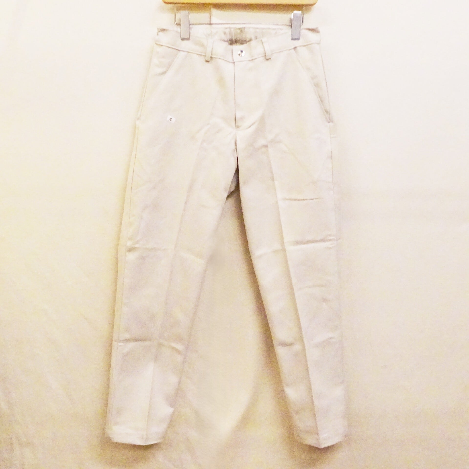ウエスト後部のゴム入りのディテールはそのままに、フロントのタック、サイドのハンマーポケット、ウエストのドローコードを省き、シルエットはウエスト、ヒップ周り、太ももを少し緩やかなラインに変更。従来のワークトラウザーは細身なシルエットですが、こちらのモデルはテーパードのかかり具合が緩やかなのが特徴のモデルになります。