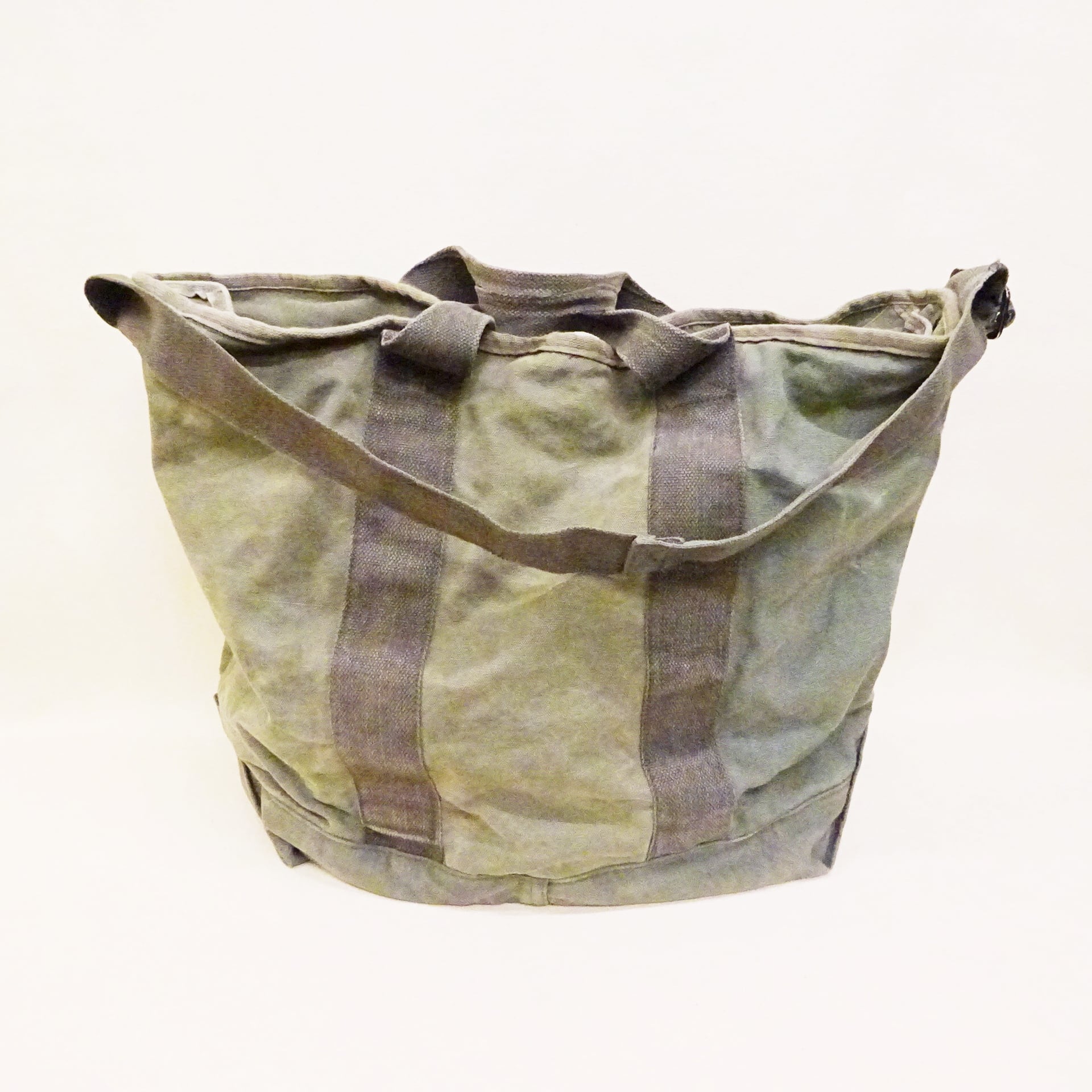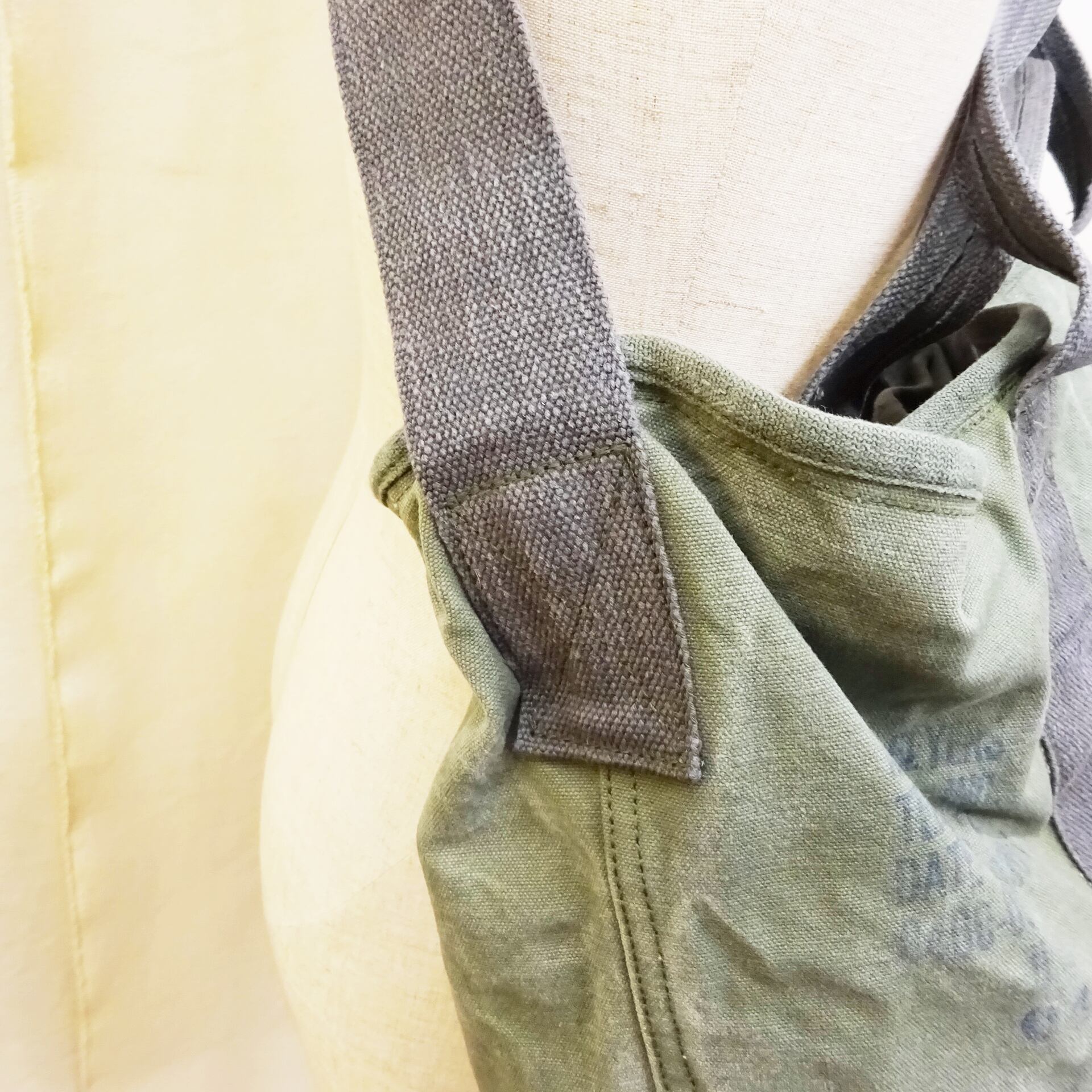 元来、パラシュートなどを収納する大型バッグで日常使いには少し使いづらい部分を、ショールダー付きのトートにリメイクすることで、本来のアヴィエーターバッグの雰囲気を残しつつ日常使いに使いやすいバッグに仕上げられています。