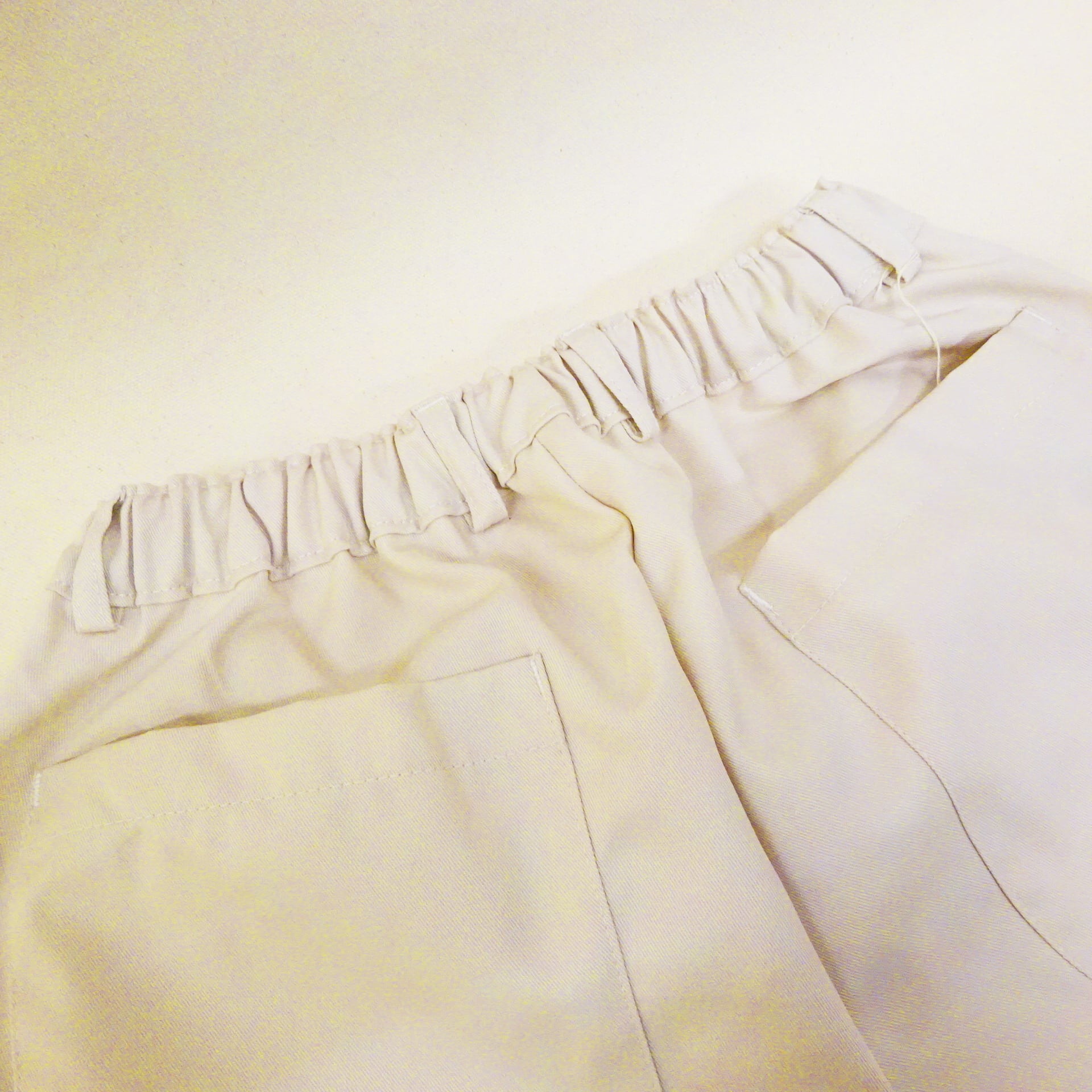 ウエスト後部のゴム入りのディテールはそのままに、フロントのタック、サイドのハンマーポケット、ウエストのドローコードを省き、シルエットはウエスト、ヒップ周り、太ももを少し緩やかなラインに変更。従来のワークトラウザーは細身なシルエットですが、こちらのモデルはテーパードのかかり具合が緩やかなのが特徴のモデルになります。