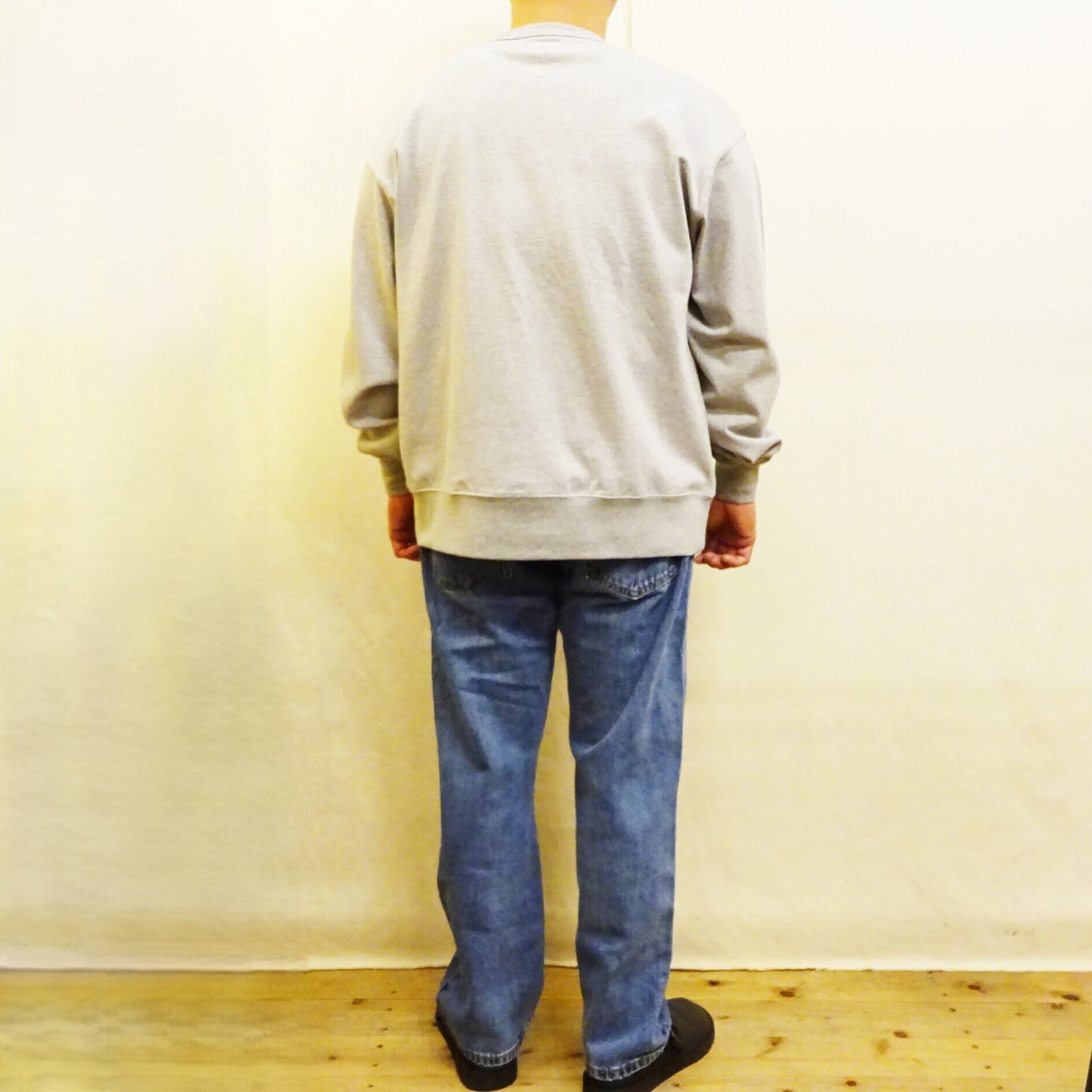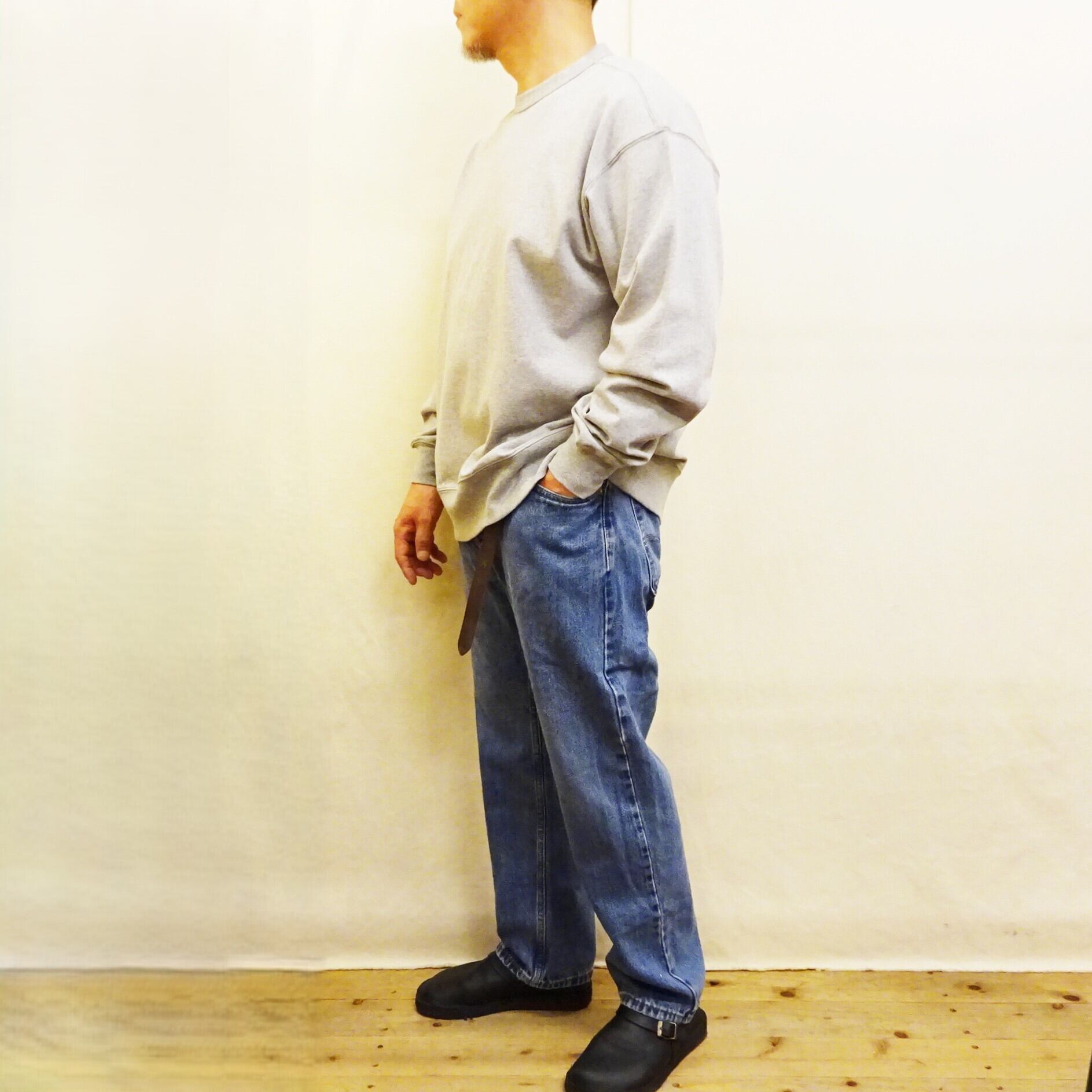 デザインはシンプルな無地のクルーネックですが、生地との相性を考量したスウェットライクなデザインで、着た際に生地の強さにストレスを感じないように、少し肩を落とし短めの着丈で非常にバランスの取れたシルエットの1枚です。