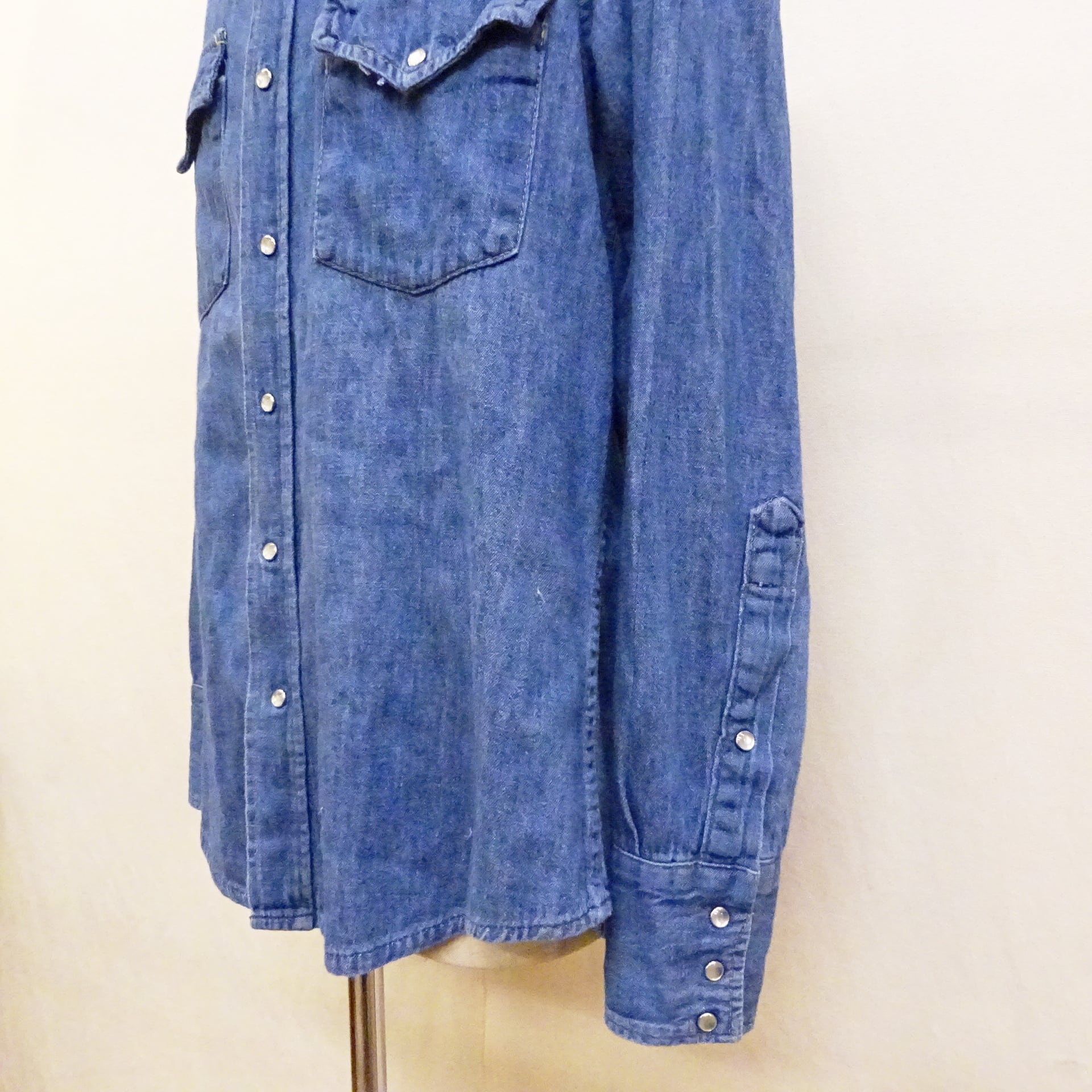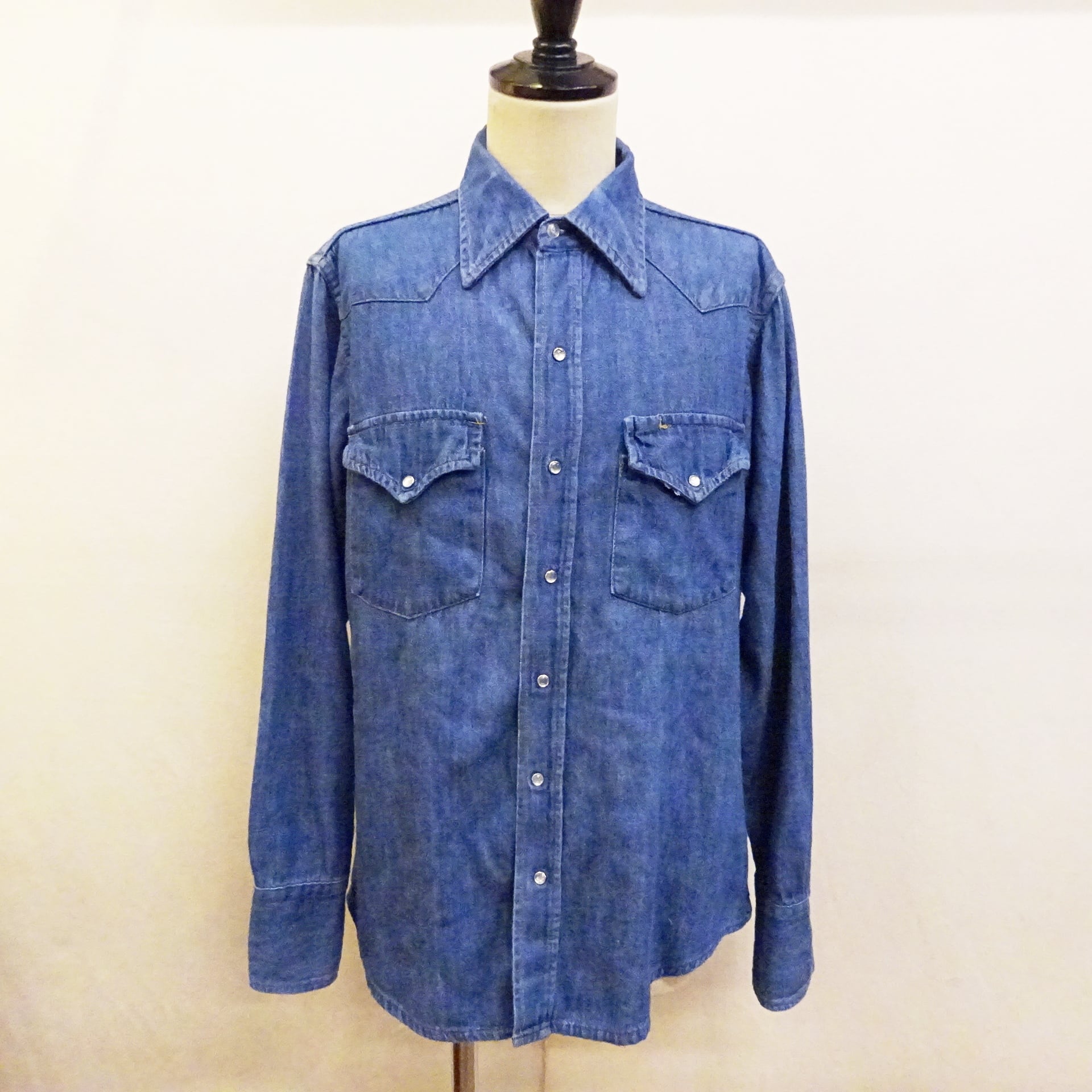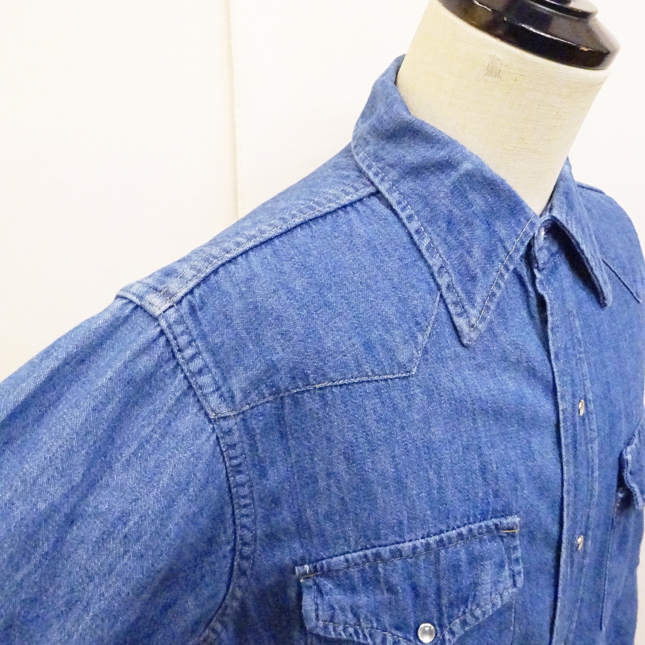 こちらは70年代頃のアイテムで、ライトオンスデニムを使用した軽くて着やすいウエスタンシャツになります。各所ボタンはパールスナップ仕様のSEARS ROEBUCKS物でヴィンテージシャツでもお好きな方も多い1枚です。サイズの方は15 1/2で表記通りサイズ感で、ウエスタンシャツらしい細身なシルエットになります。