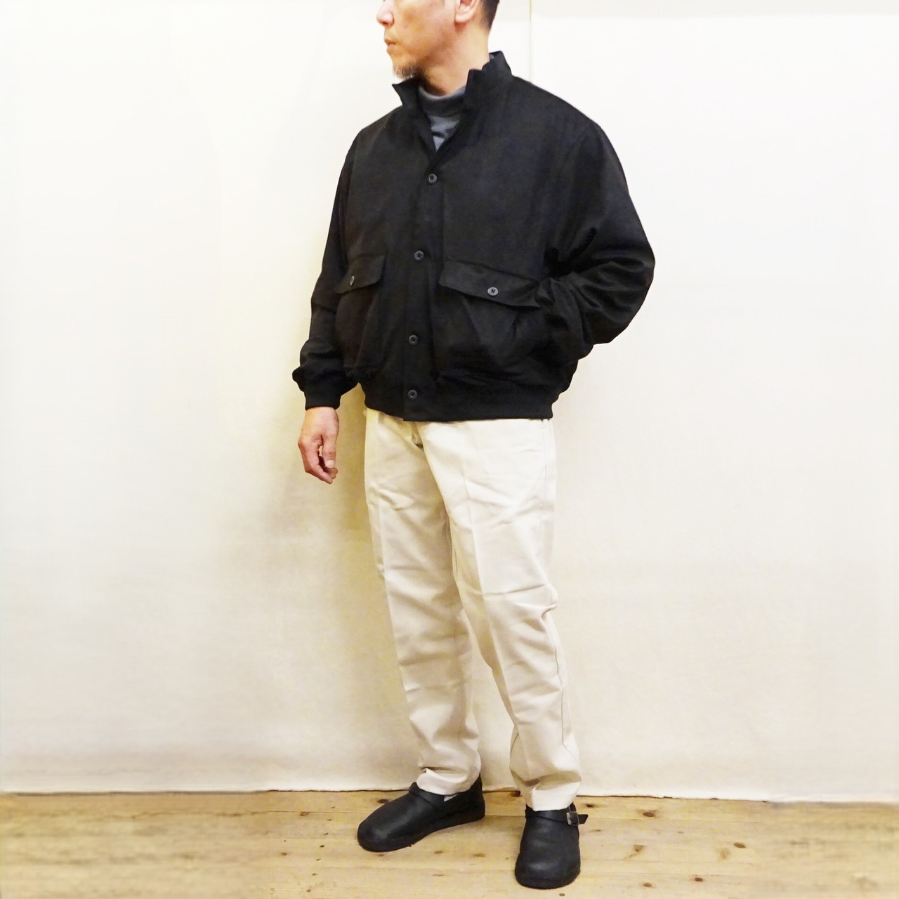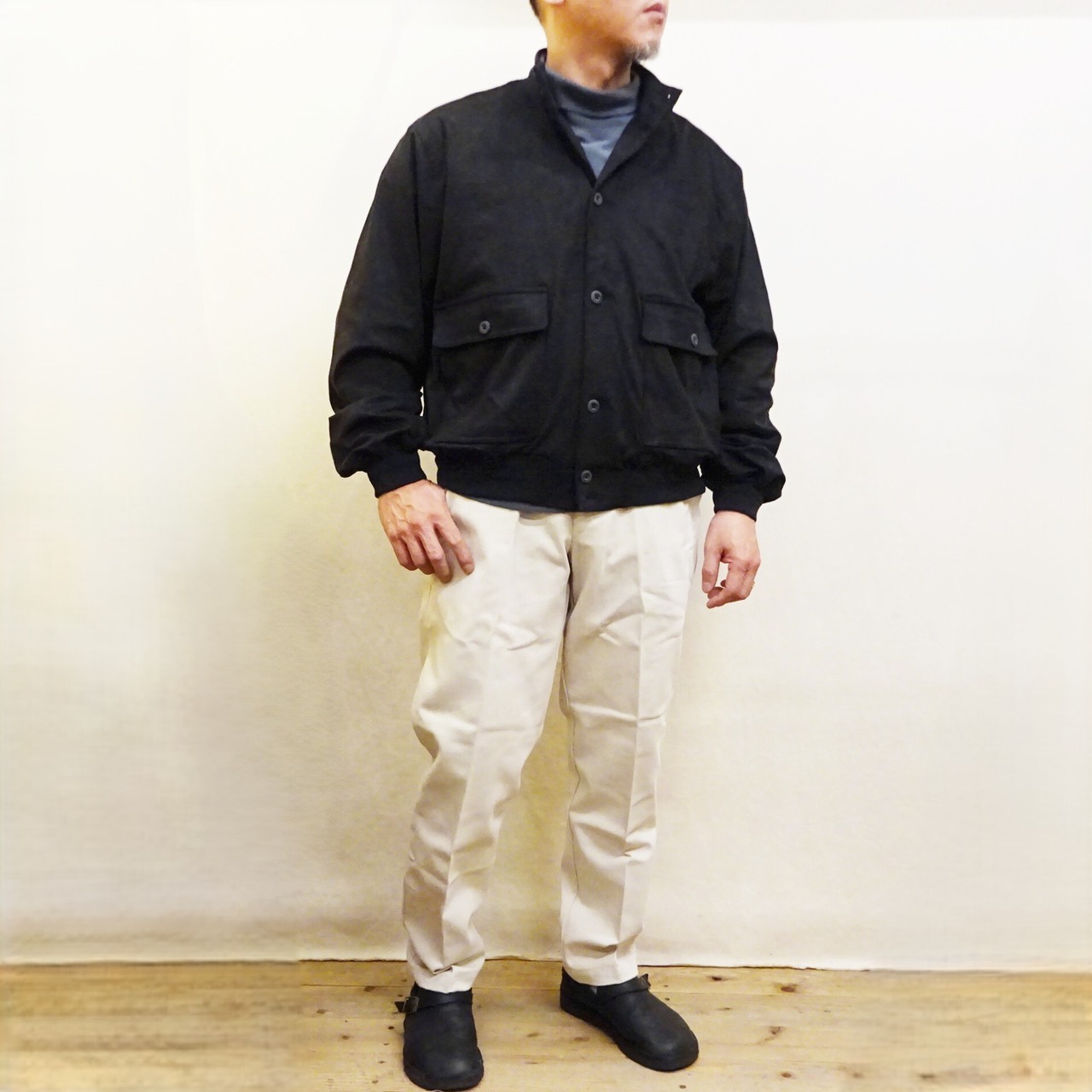 適度な光沢を感じるフェイクスウェードを使用し、クラシックな雰囲気を損なわないボックスシルエットの1枚。うっすら起毛がかった肌あたりの良い素材と、着用した際のストレスを感じさせないシルエットで、ドライブ時やカジュアルスタイルに加え、ドレススタイルにも使える非常に汎用性の高いジャケットです。
