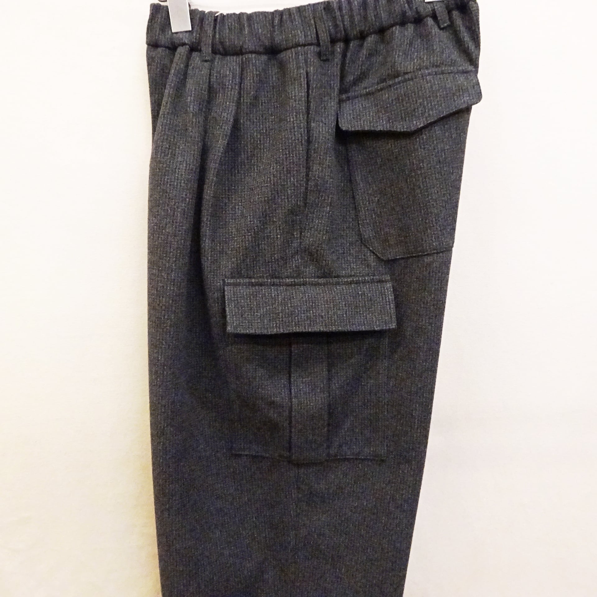 ミリタリーな雰囲気をイージー仕様に上手く落とし込み、ウエストはゴムでしっかり収まるジャストな設定。ツータック入りですがセンタークリースを入れずにカジュアルに寄せ、繊細なハウンドトゥース柄で纏められた、いろんな要素が垣間見え様々なスタイリングでの掛け合わせが楽しめるカーゴパンツです。
