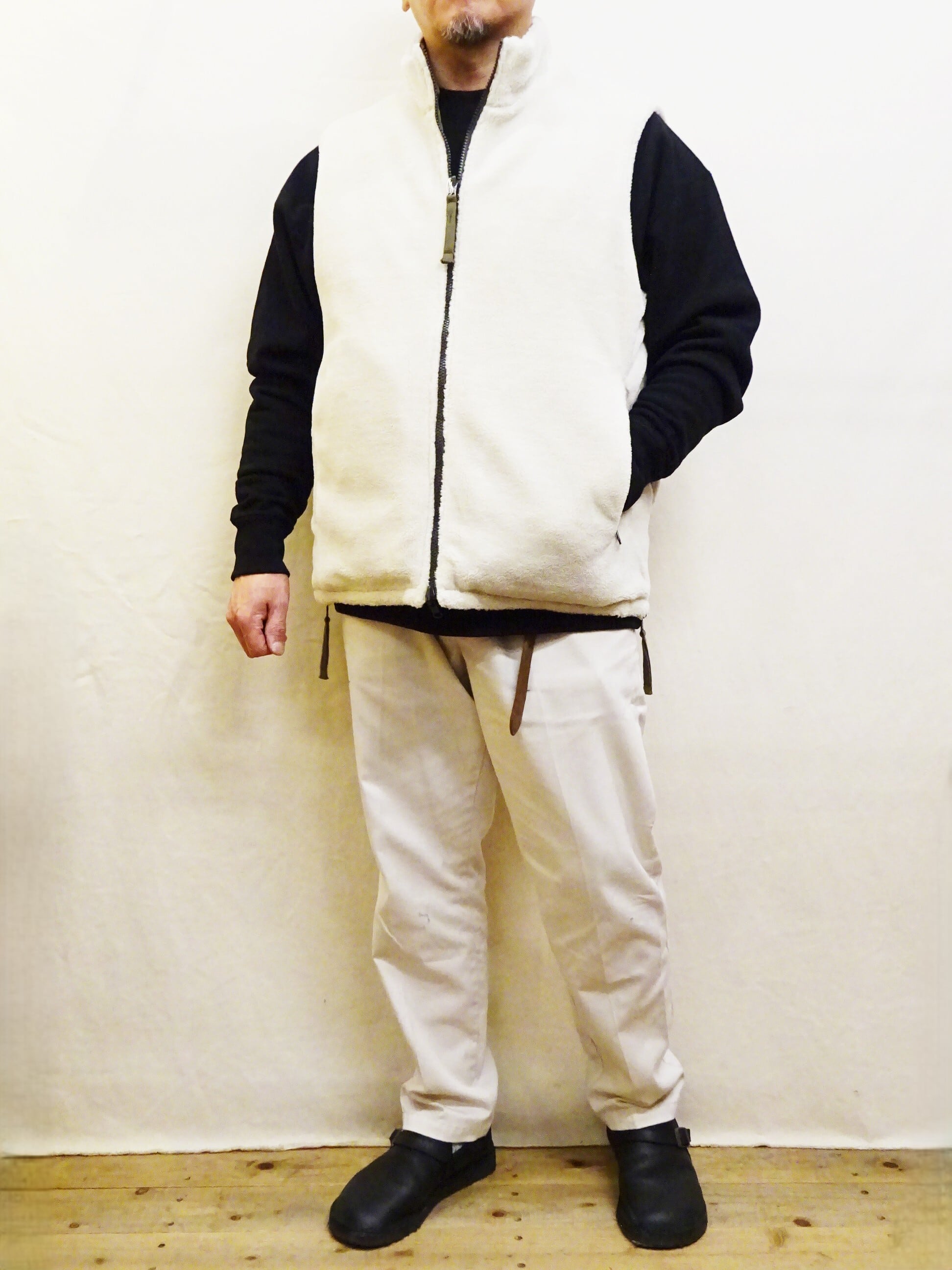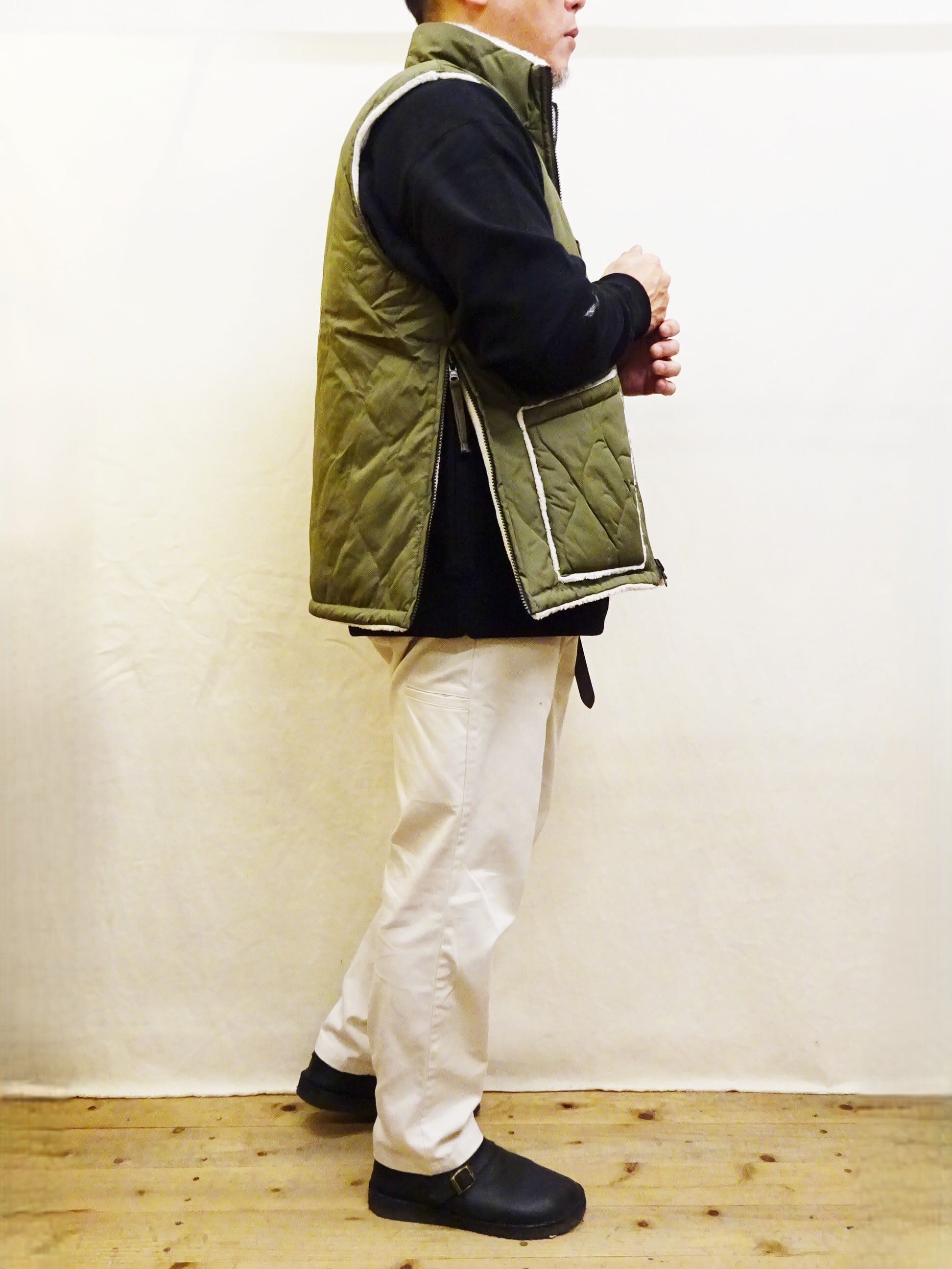 同ブランドにて展開するミリタリーラインの新作の1枚。表側には丈夫なリップストップ生地を使用し、ヘチマキルトのダウンステッチでミリタリーらしさを感じさせてくれる仕様、裏側は毛羽感のあるボアを採用し、防寒性と防風性を高めてくれる仕様になっています。