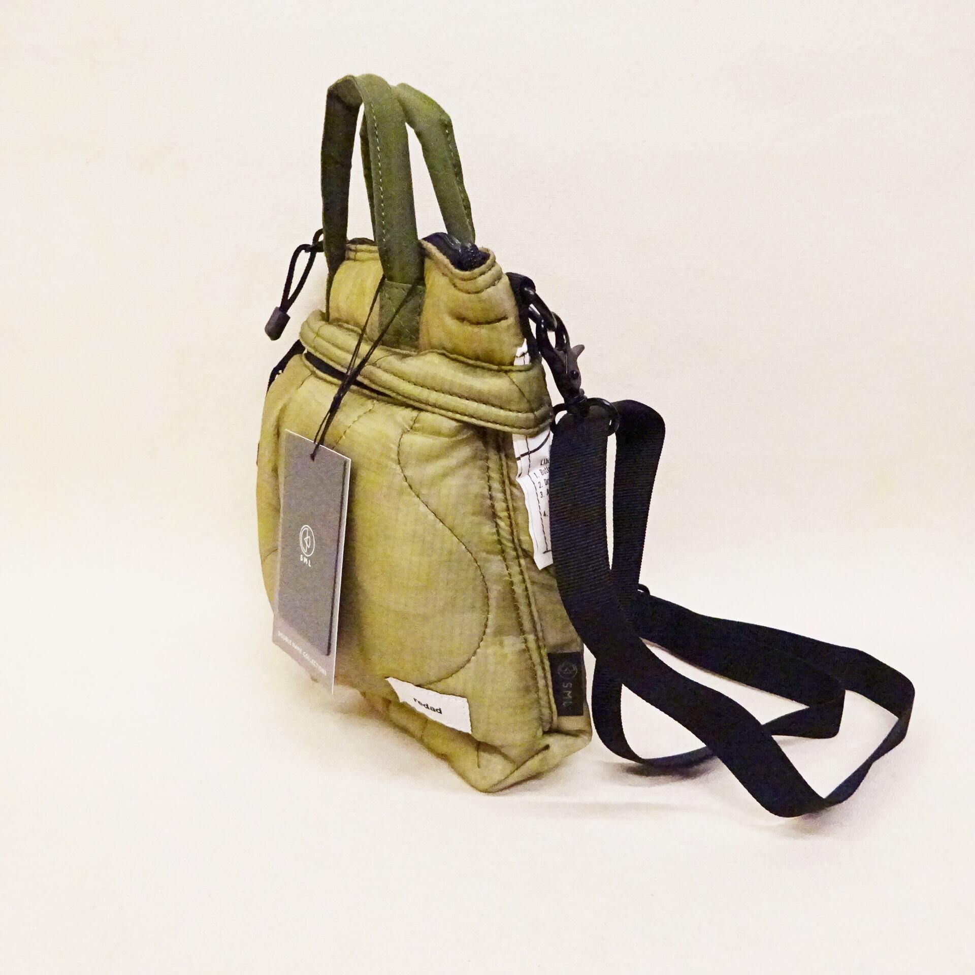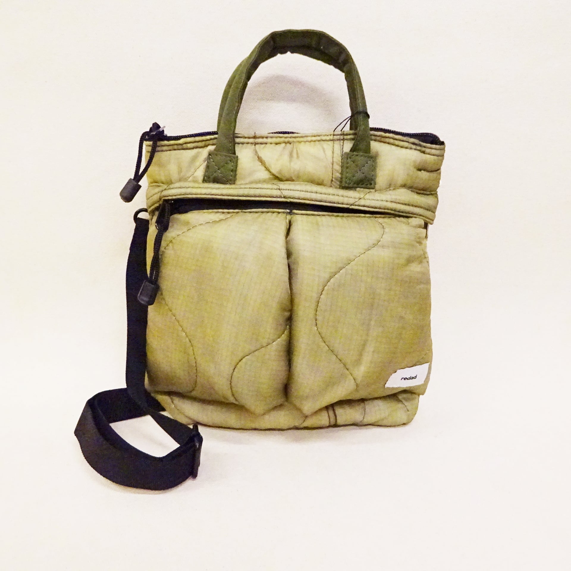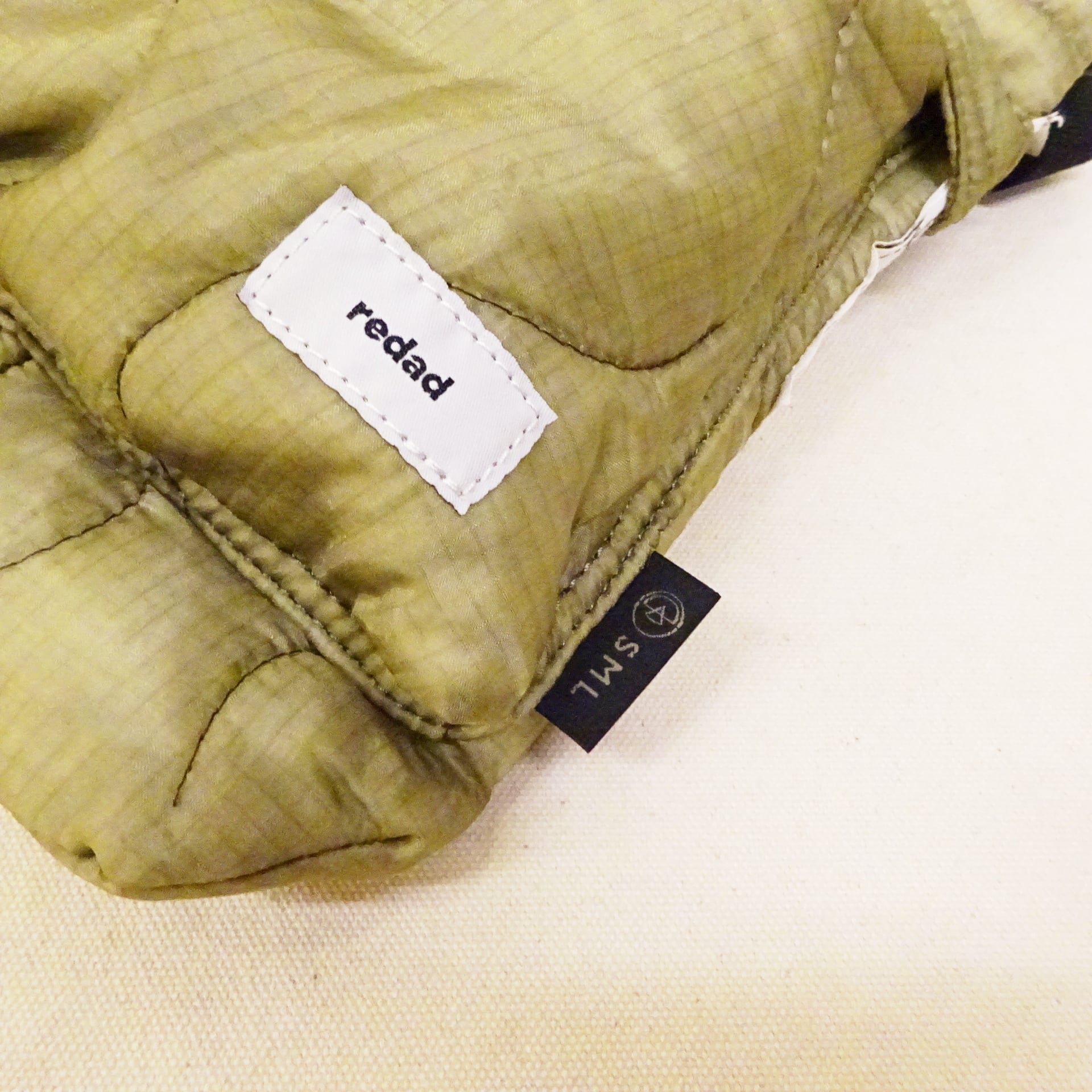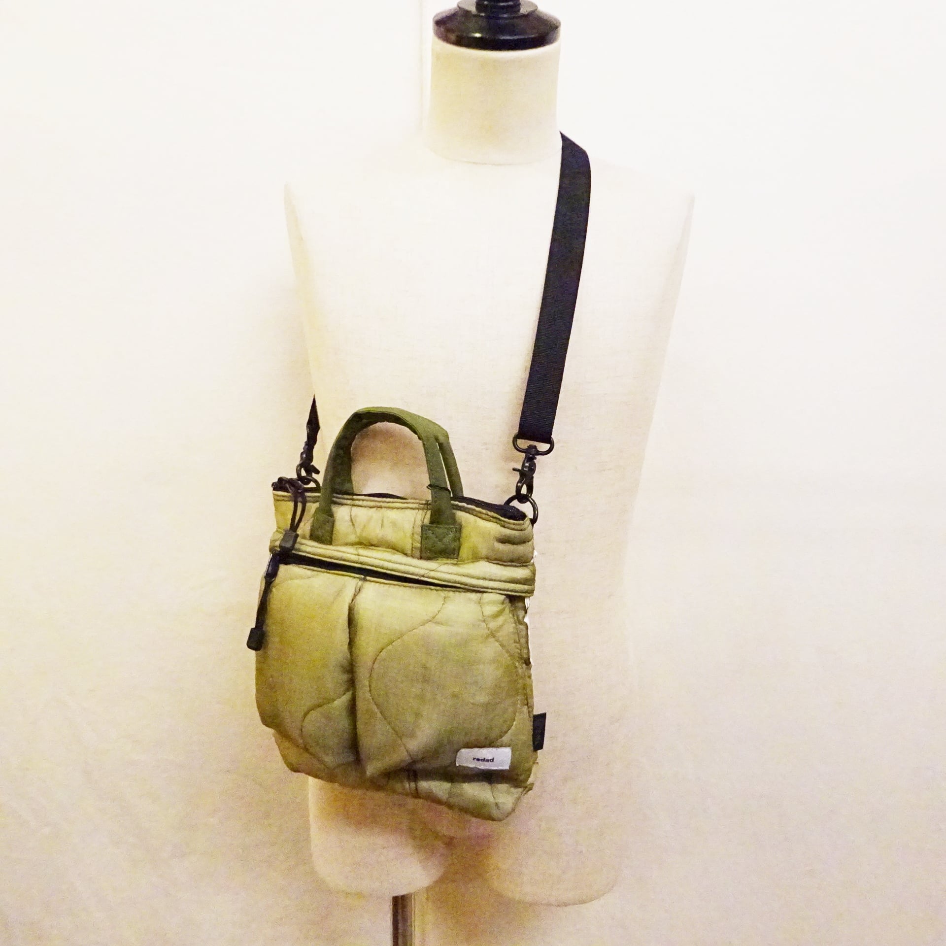 今回使用された素材はredadが得意とする80年代頃のデッドストック キルティングライナー。そちらを解体し再度SMLらしいデザインのヘルメットバッグに再構築された非常に雰囲気のあるバッグになります。