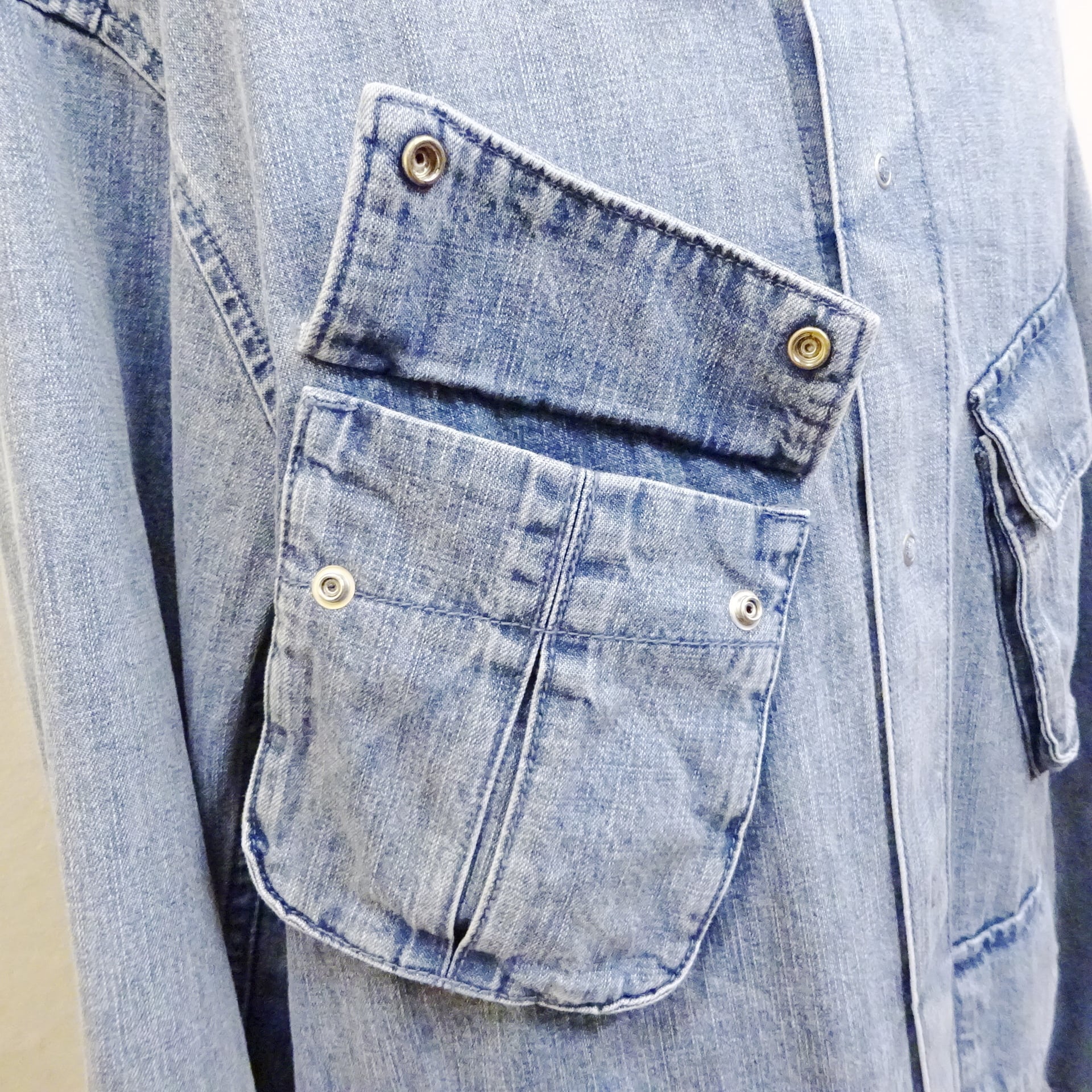 フロントにはジャングルファティーグでお馴染みの容量のあるポケットを装備。マチもあり、スマホや普段使いの小物まで収納できるので、敢えてこのポケット使用する事で一段と雰囲気良くこちらのシャツを愛用して頂けるかと思います。