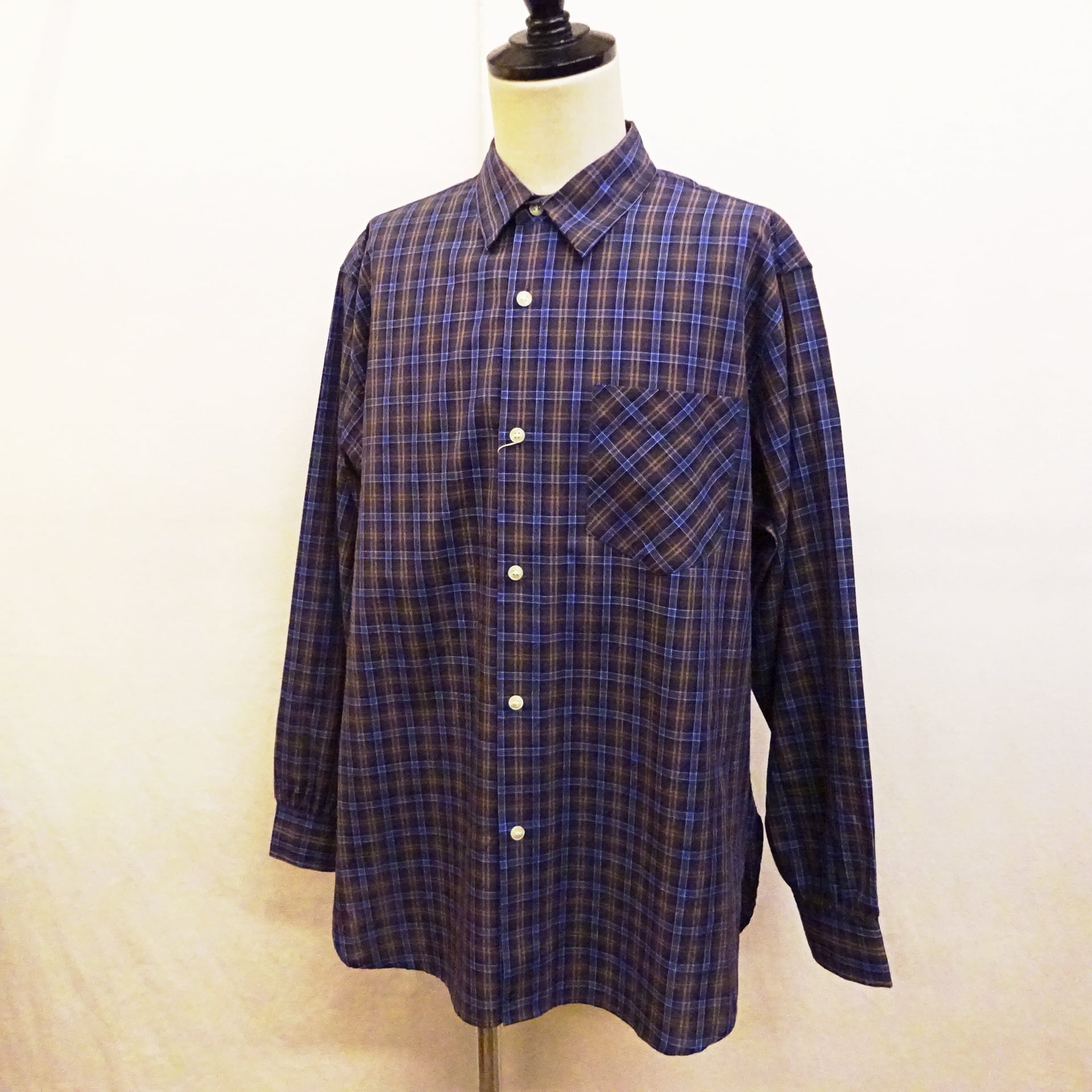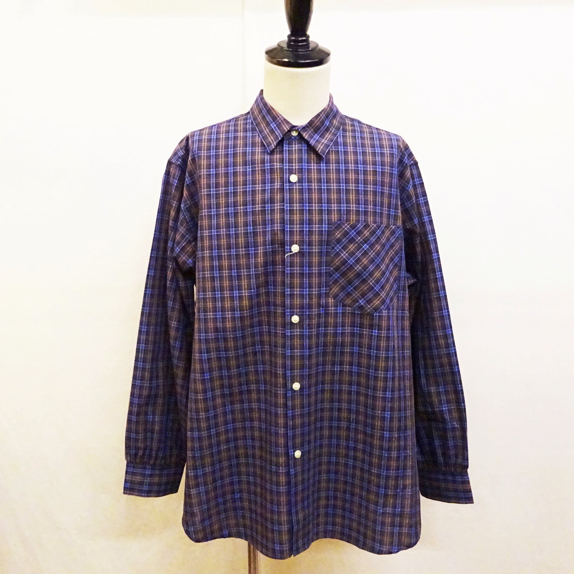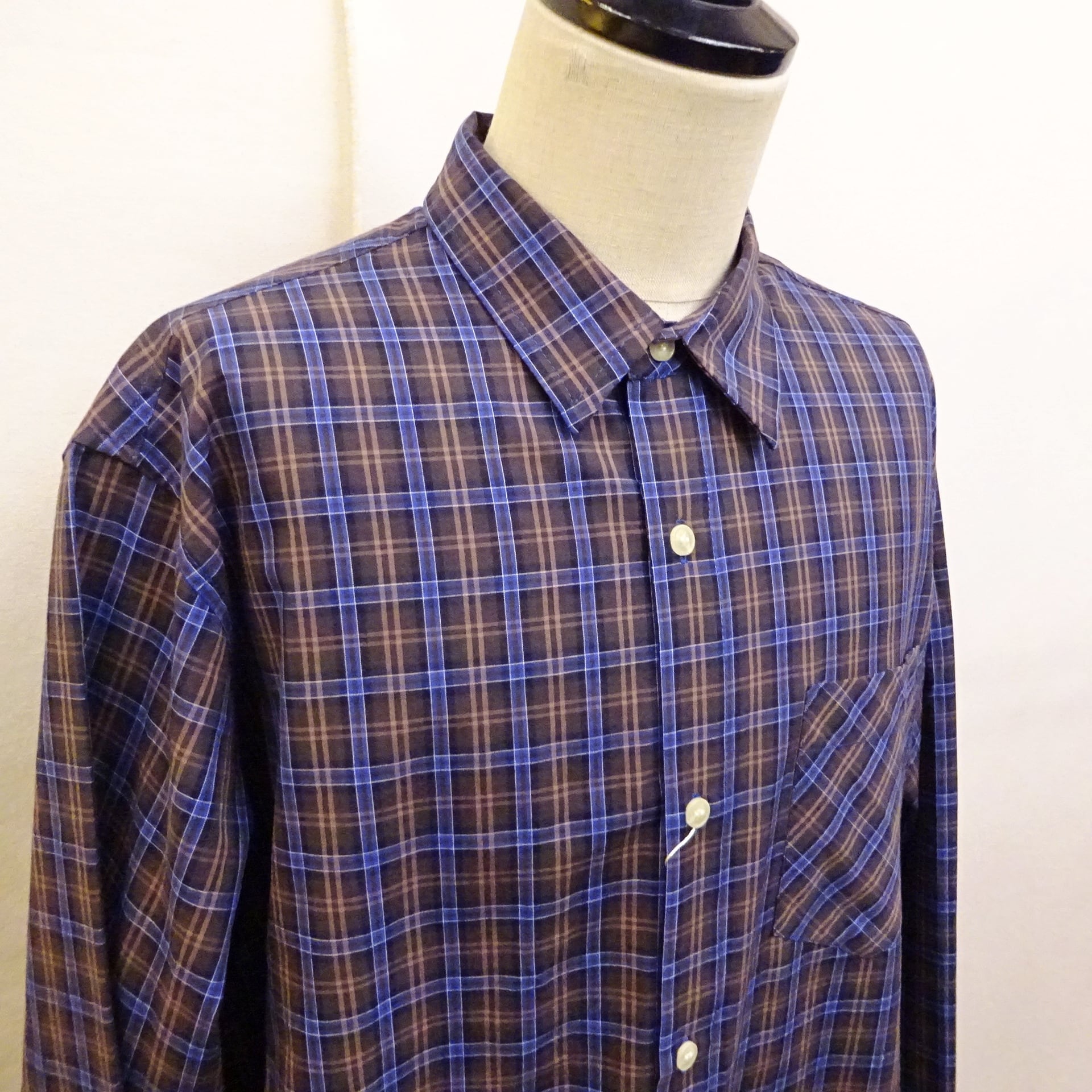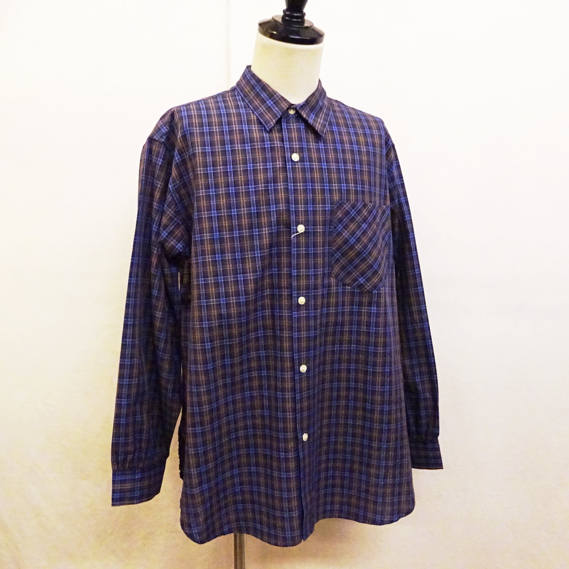 90年代頃のアメリカシャツによく見るブロード織りのチェック柄シャツ。程良い薄手の生地に、着丈や身幅のバランスもプレーンでsimple is bestな1枚。普段はシャツを着ない方にも気軽に着て頂けるシャツになります。