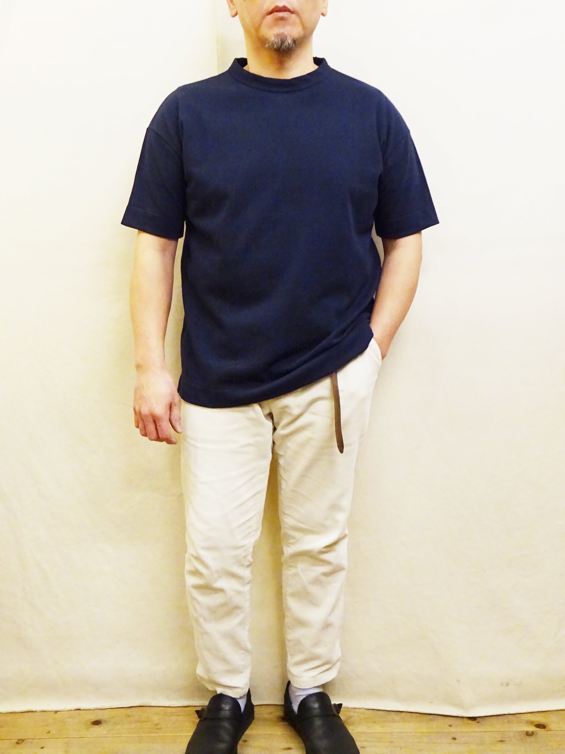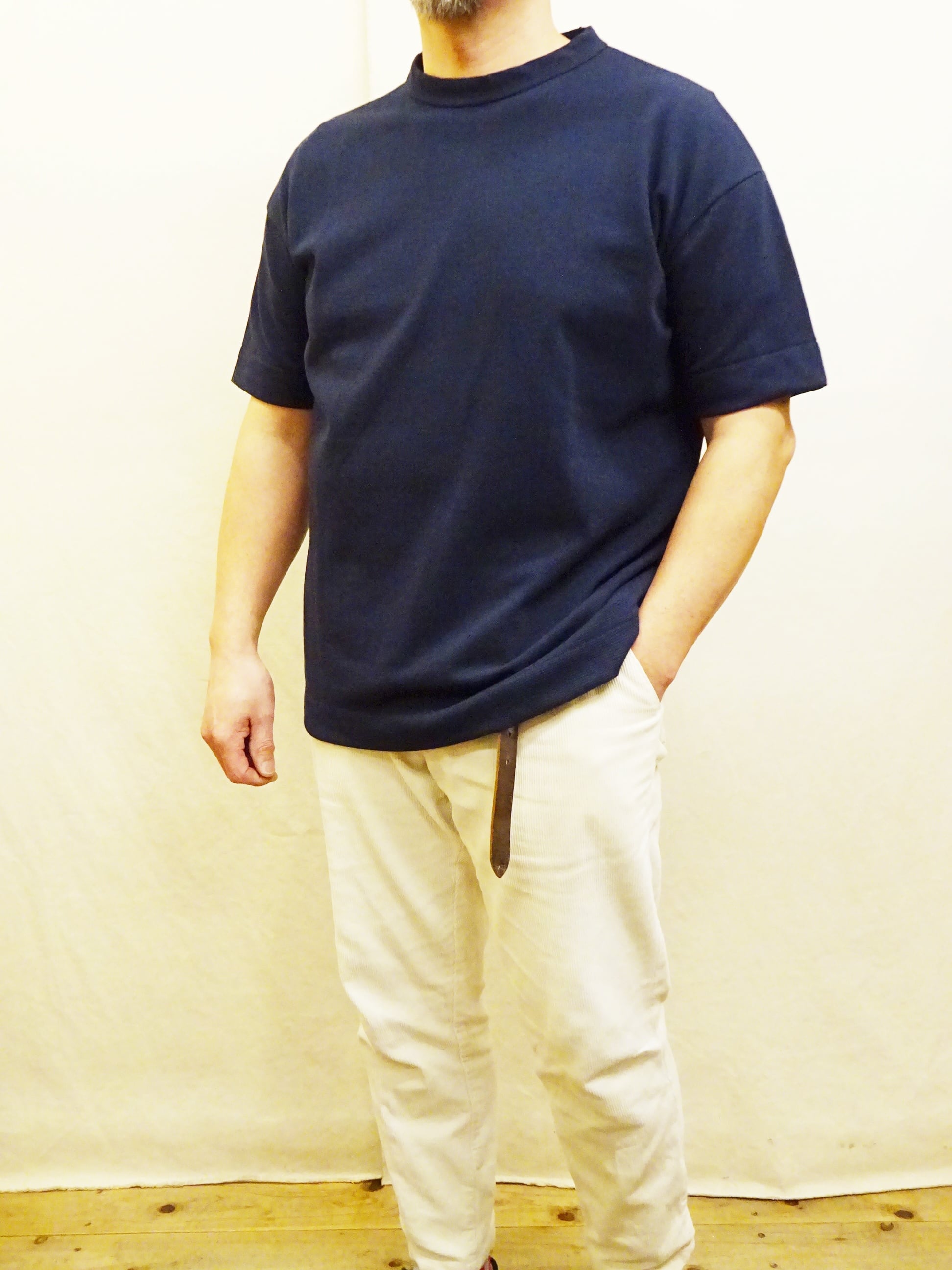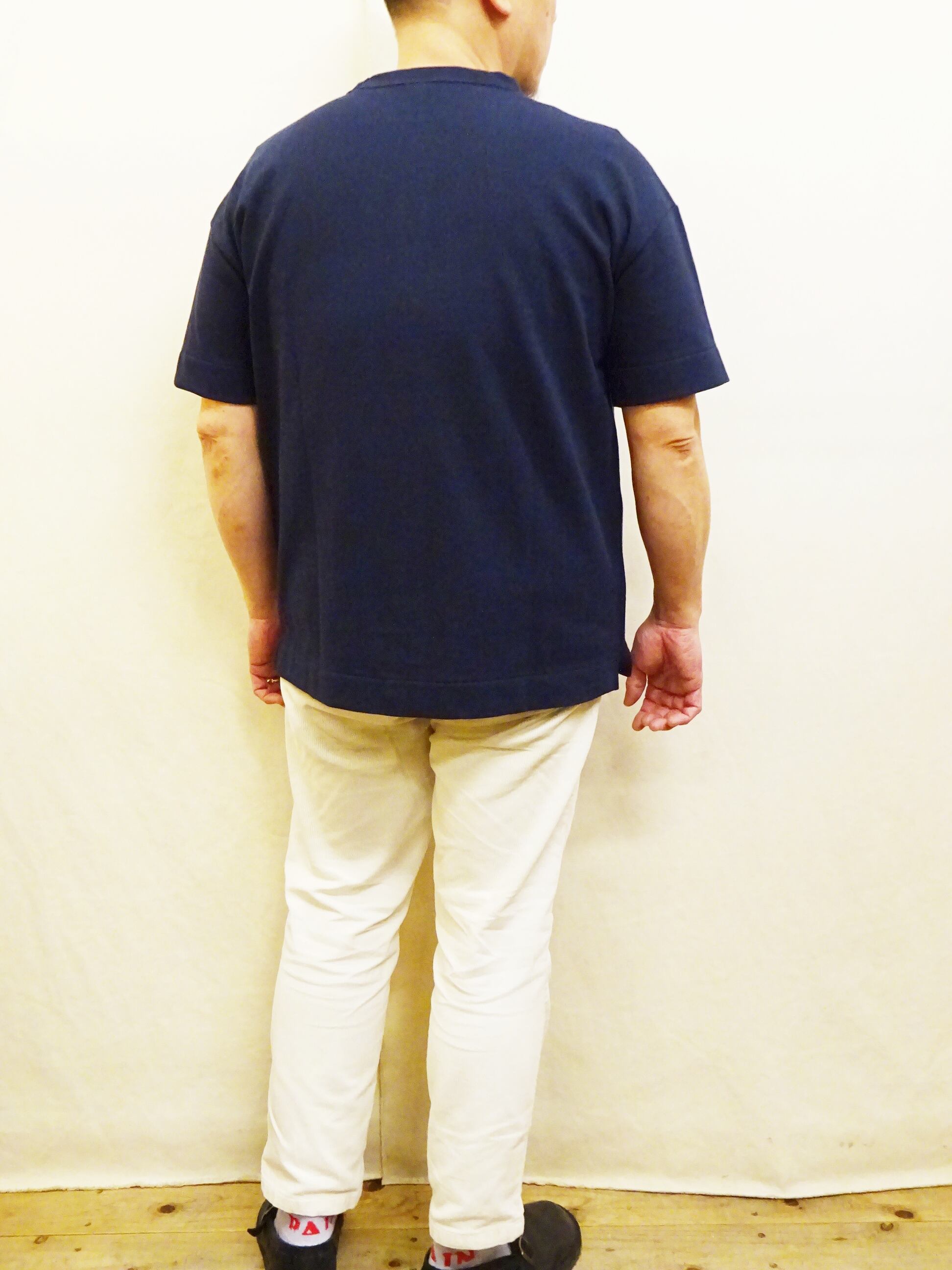 型はシンプルなクルーネックTシャツになりますが、身幅に対して少し細めに設定されたアームでカジュアルになり過ぎないキレイ目なTシャツに仕上がっています。