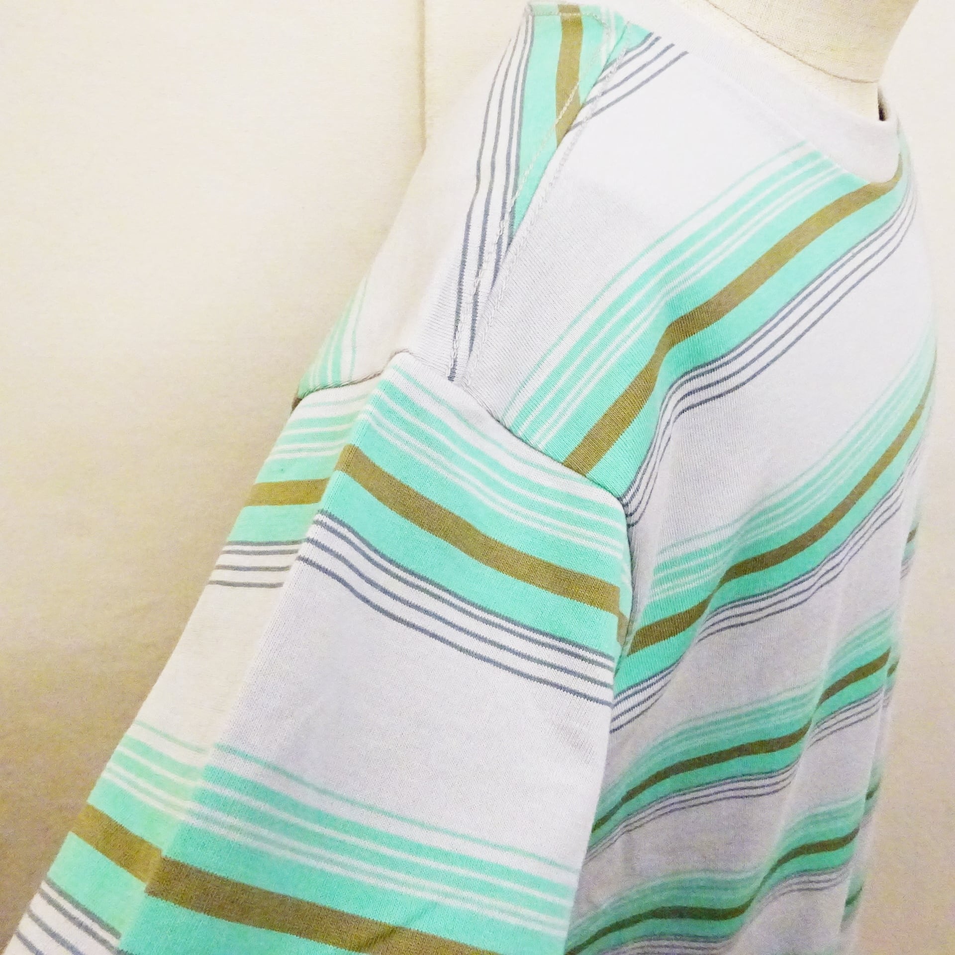 落ち着いたマルチカラーな配色とクラシカルな印象である首元のリンガー仕上げで、古い映画で登場しそうなレトロ感を感じる1枚。