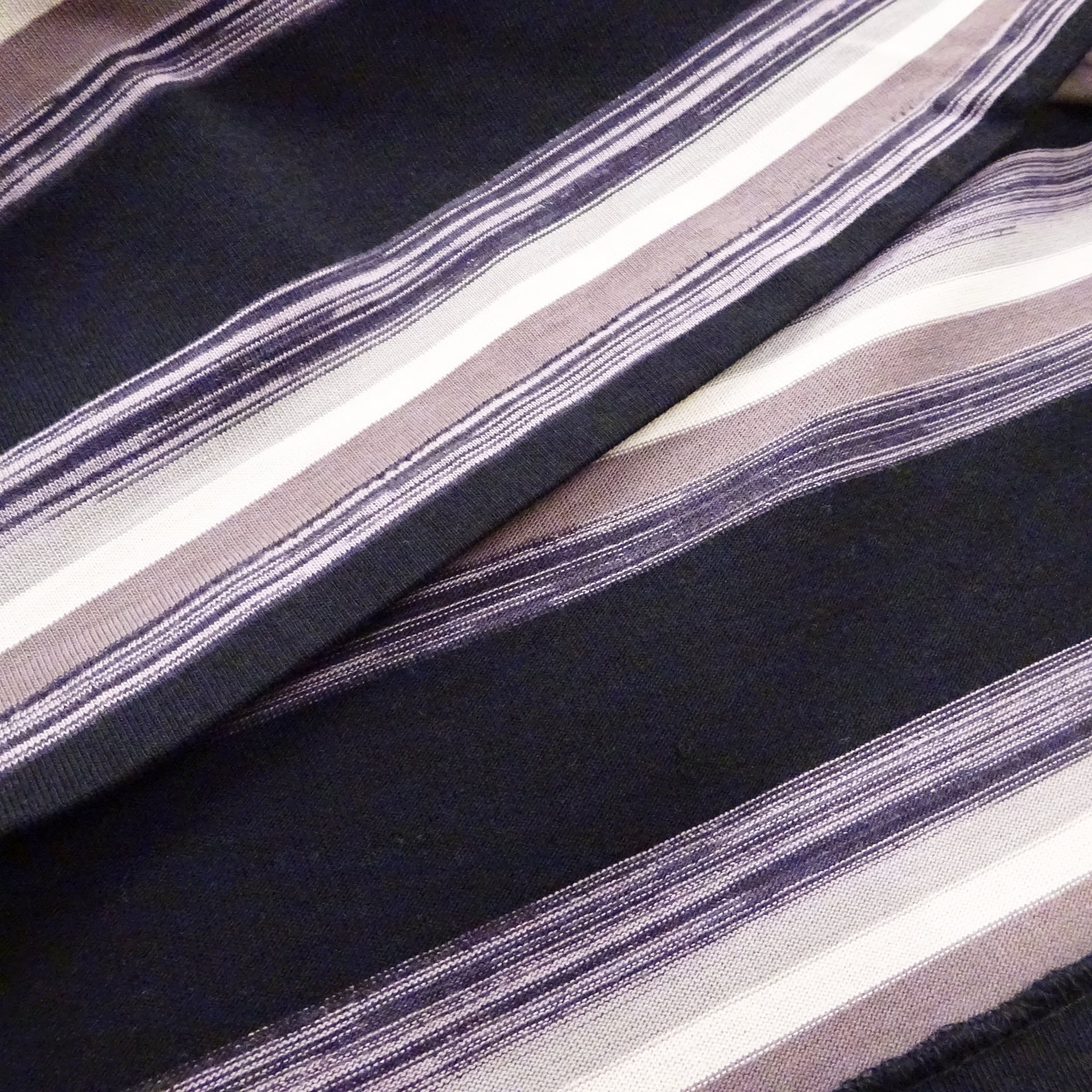 落ち着いたマルチカラーな配色とクラシカルな印象である首元のリンガー仕上げで、古い映画で登場しそうなレトロ感を感じる1枚。