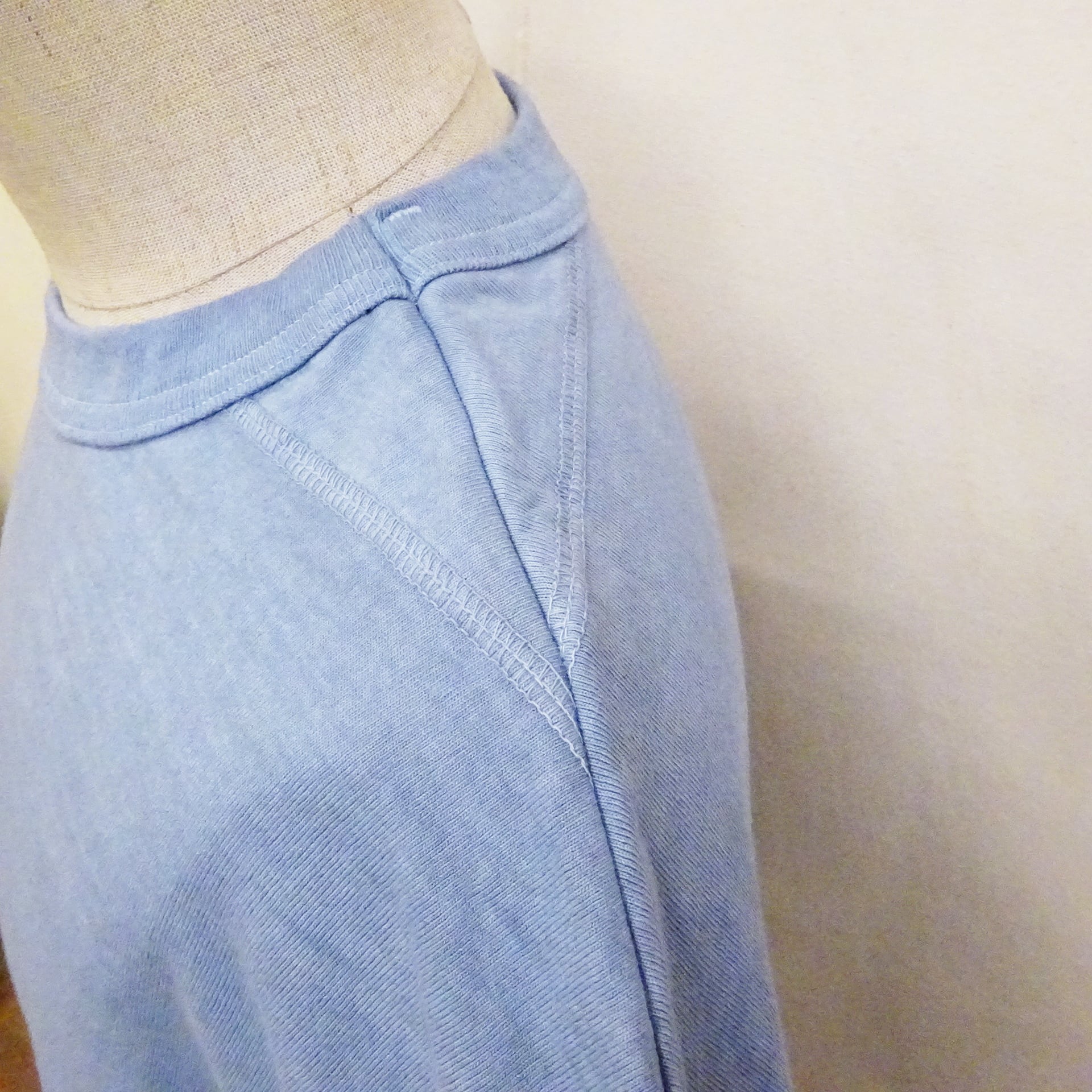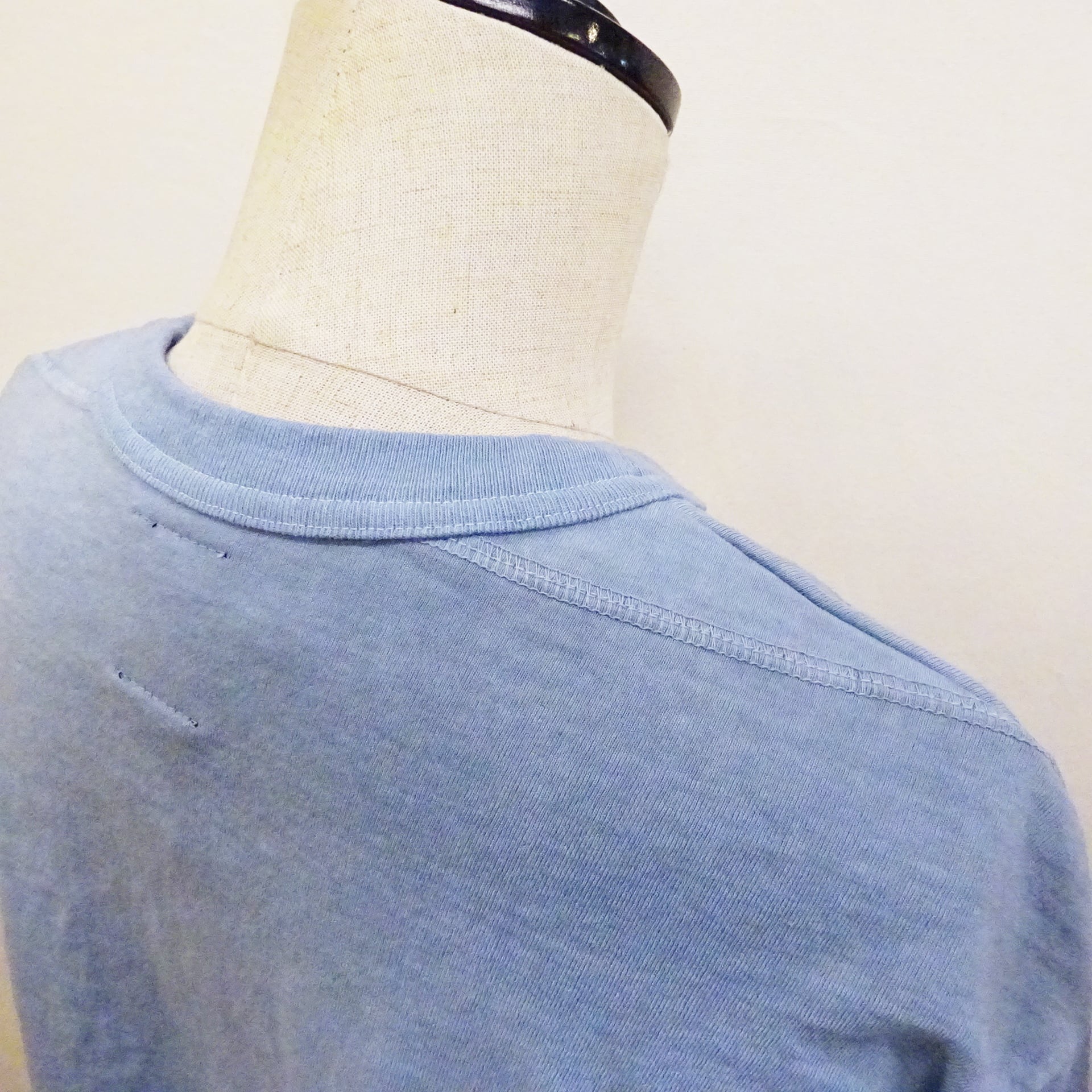 身頃生地を二重にし肩の三角補強ステッチがアイコニックな1着は、16番手の単糸のコットンと空紡糸を独自の割合で使用し、度を詰めてしっかりと編み立てられた生地を使用。