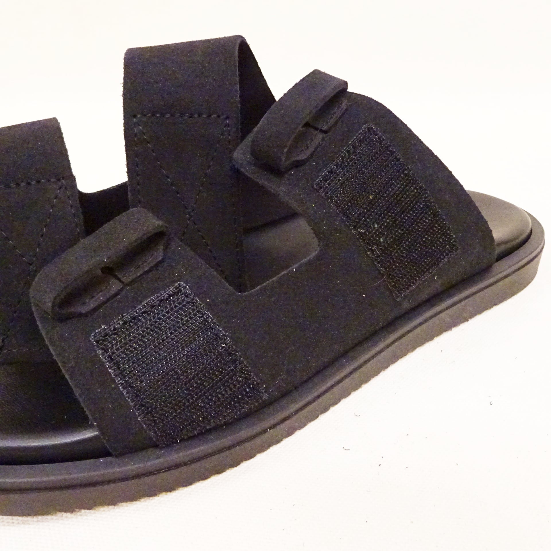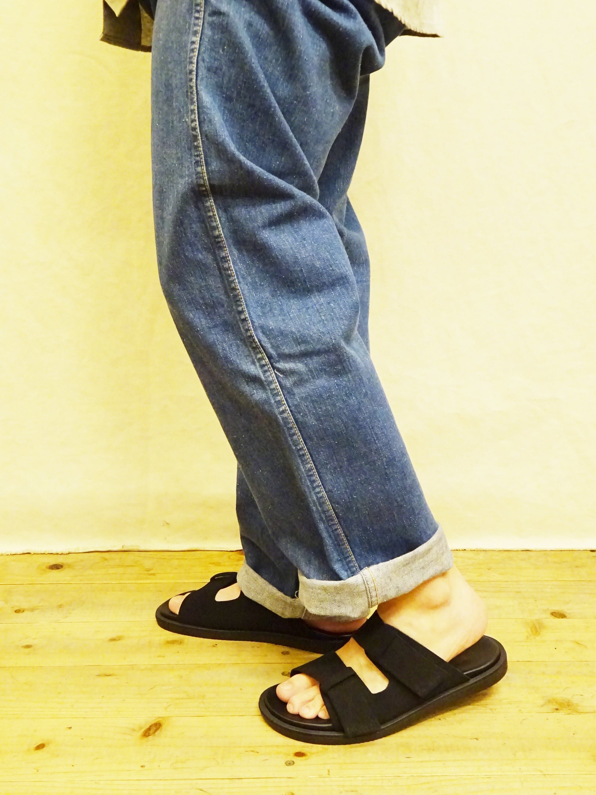 ブラックスエード特有の高級感もありながら、ラフに取り入れやすいシンプルなデザイン。サッと履けて、いつものスタイリングに取り入れるだけでサマになるサンダル。