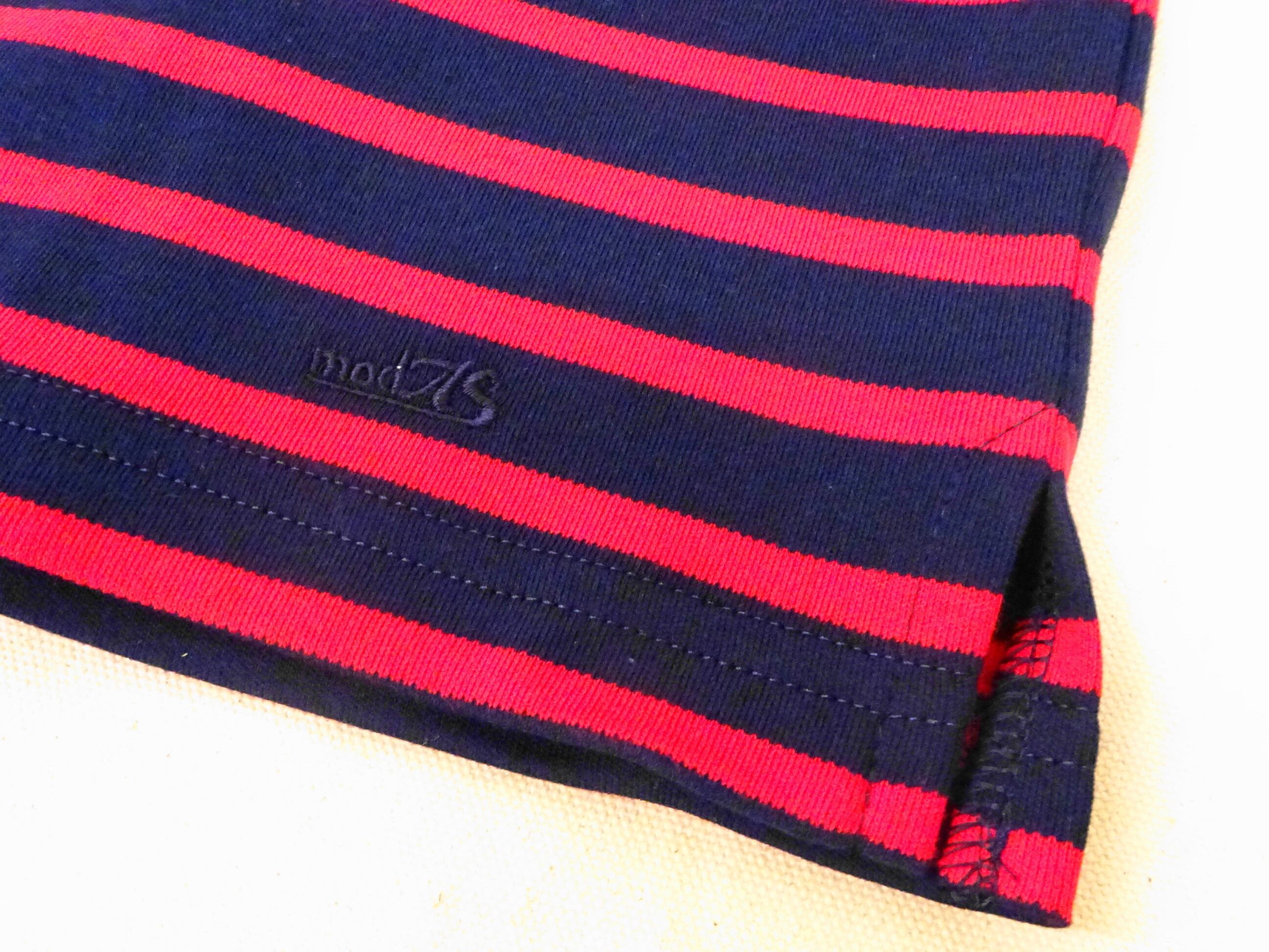 従来の硬くコシのある生地感のバスクシャツに比べ、modASは柔らかくソフトな肌触りのコットン生地を使用し、ラフに着れるゆるやかなシルエットが特徴。着心地がとても良く、首もとは浅いボートネックでストレスを感じることなく着ていただけます。裾両サイドはスリット仕様、フロント左裾にブランドネームが刺繍されています。