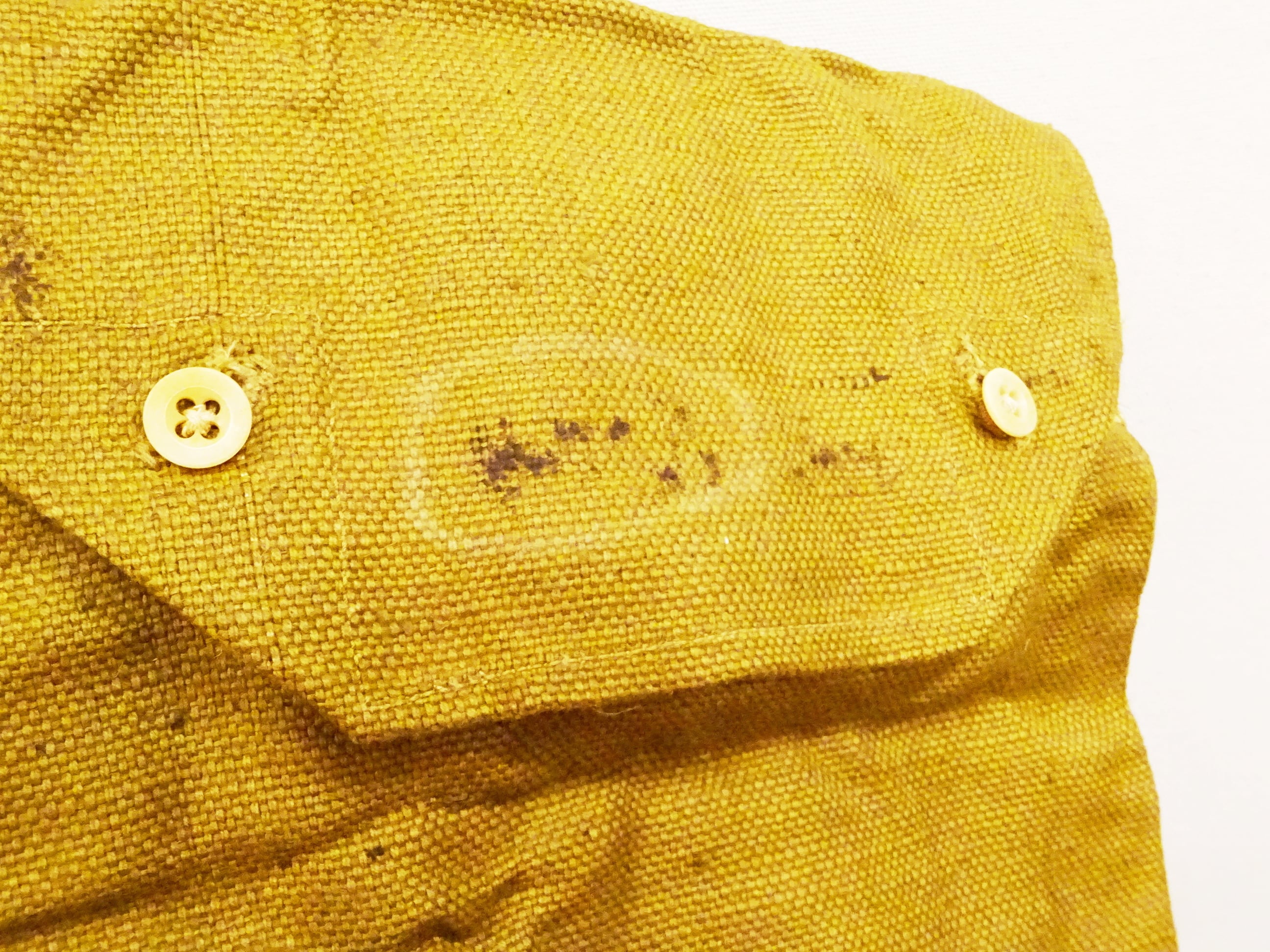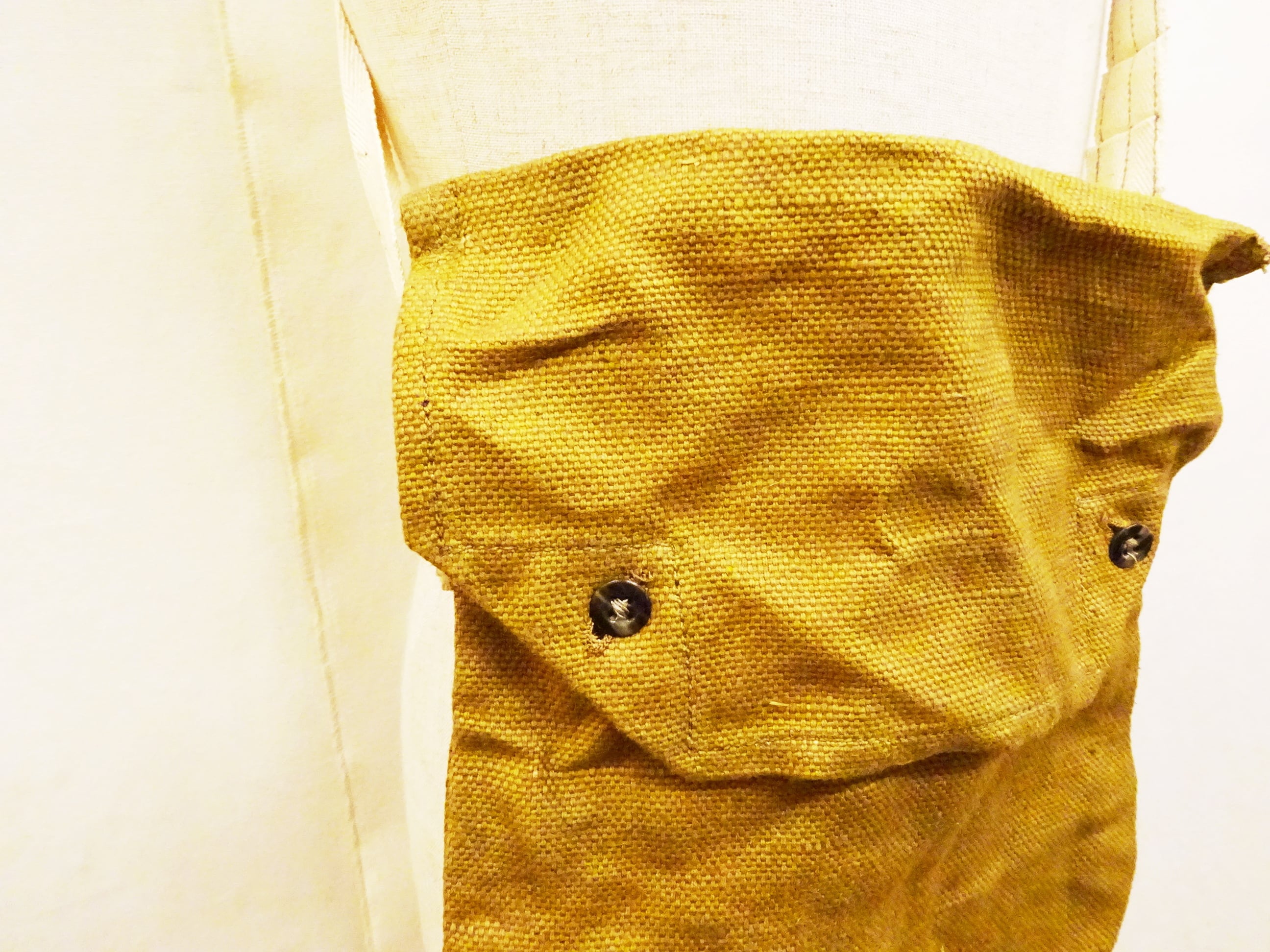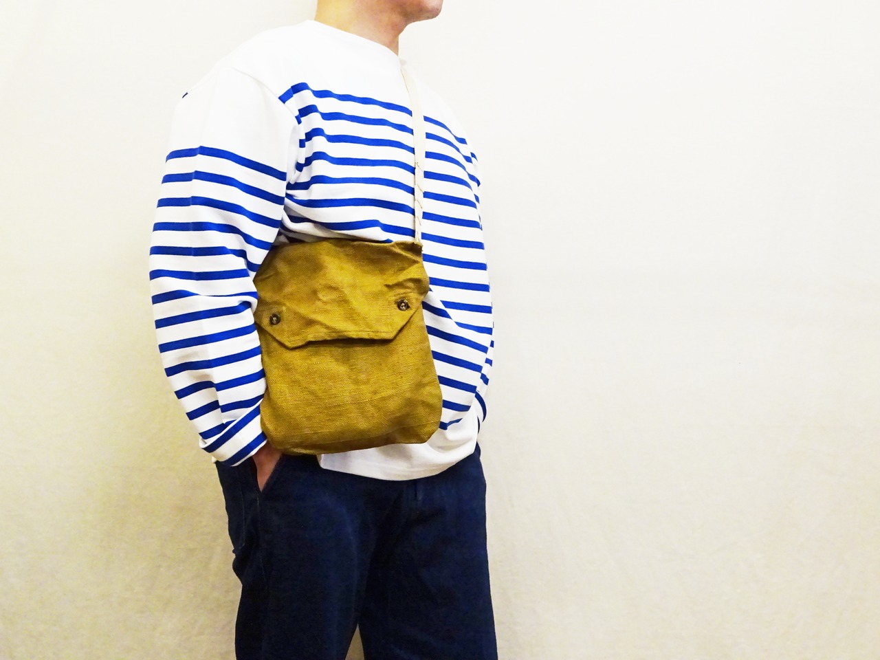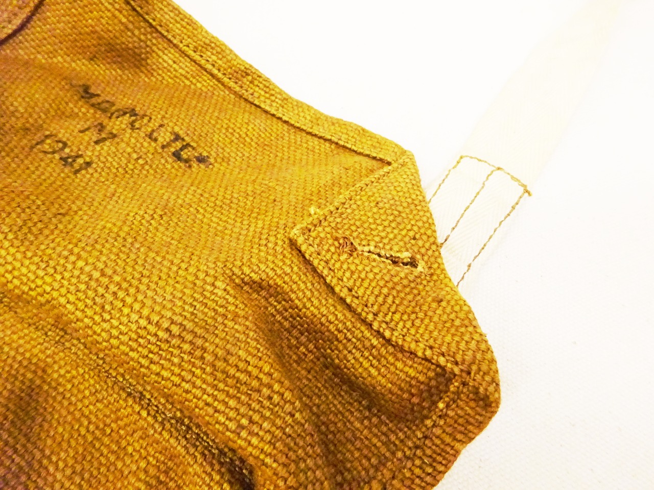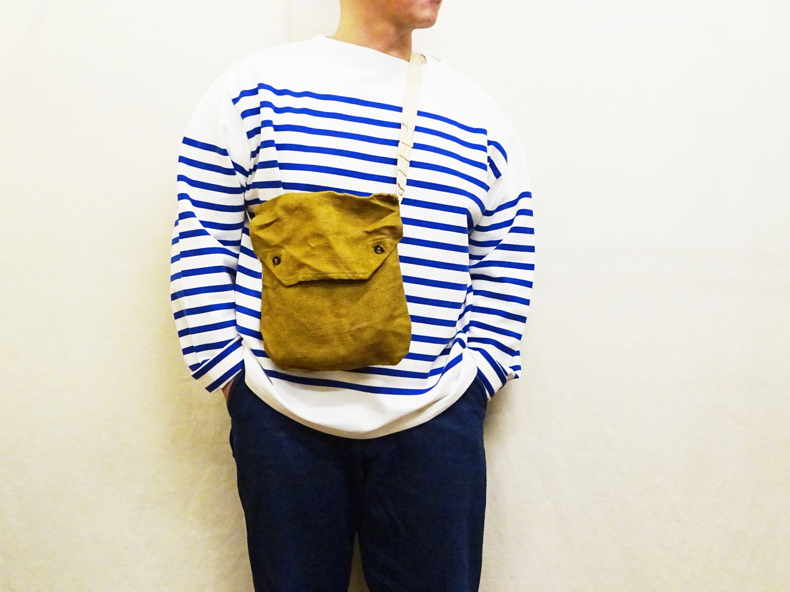 2ボタンのフラップ仕様で全体的にシンプルなバッグながら、年代を感じさせる麻袋のような生地を使用し、ヘリンボーン素材を段状に縫い込んだショルダーストラップはステッチを外すことにより長さ調整が出来る作りなど、他では見られない独特なディティールで抜群の雰囲気があるバッグです。フラップ裏のステンシルも魅力の一つですね。