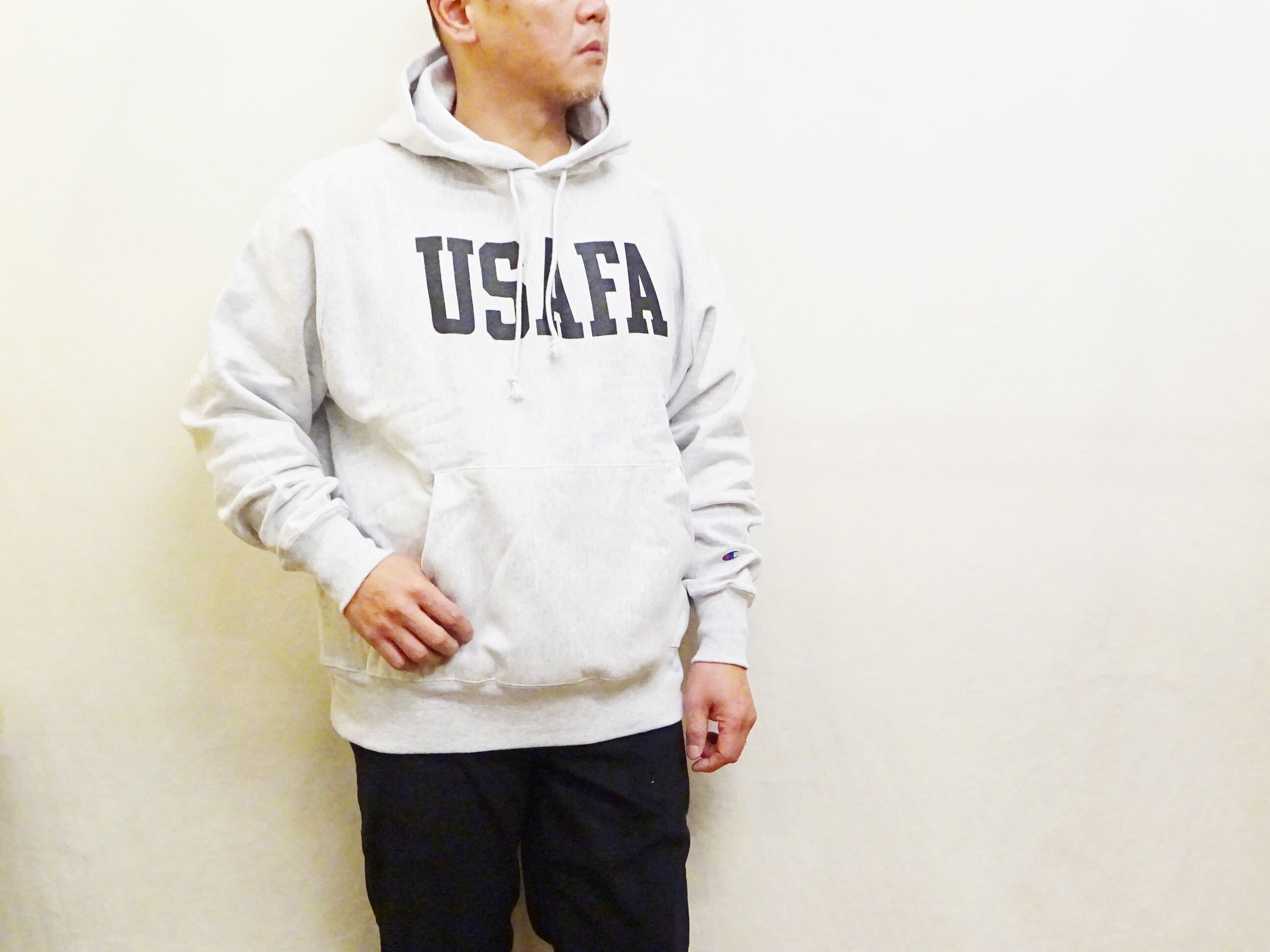 海外企画のチャンピオン リバースウィーブパーカー。USAFA(米空軍士官学校)同様のデザインでフロントにはUSAFA、バックにはV字のトレードマークが大きくラバープリントされた非常に雰囲気のある1枚です。