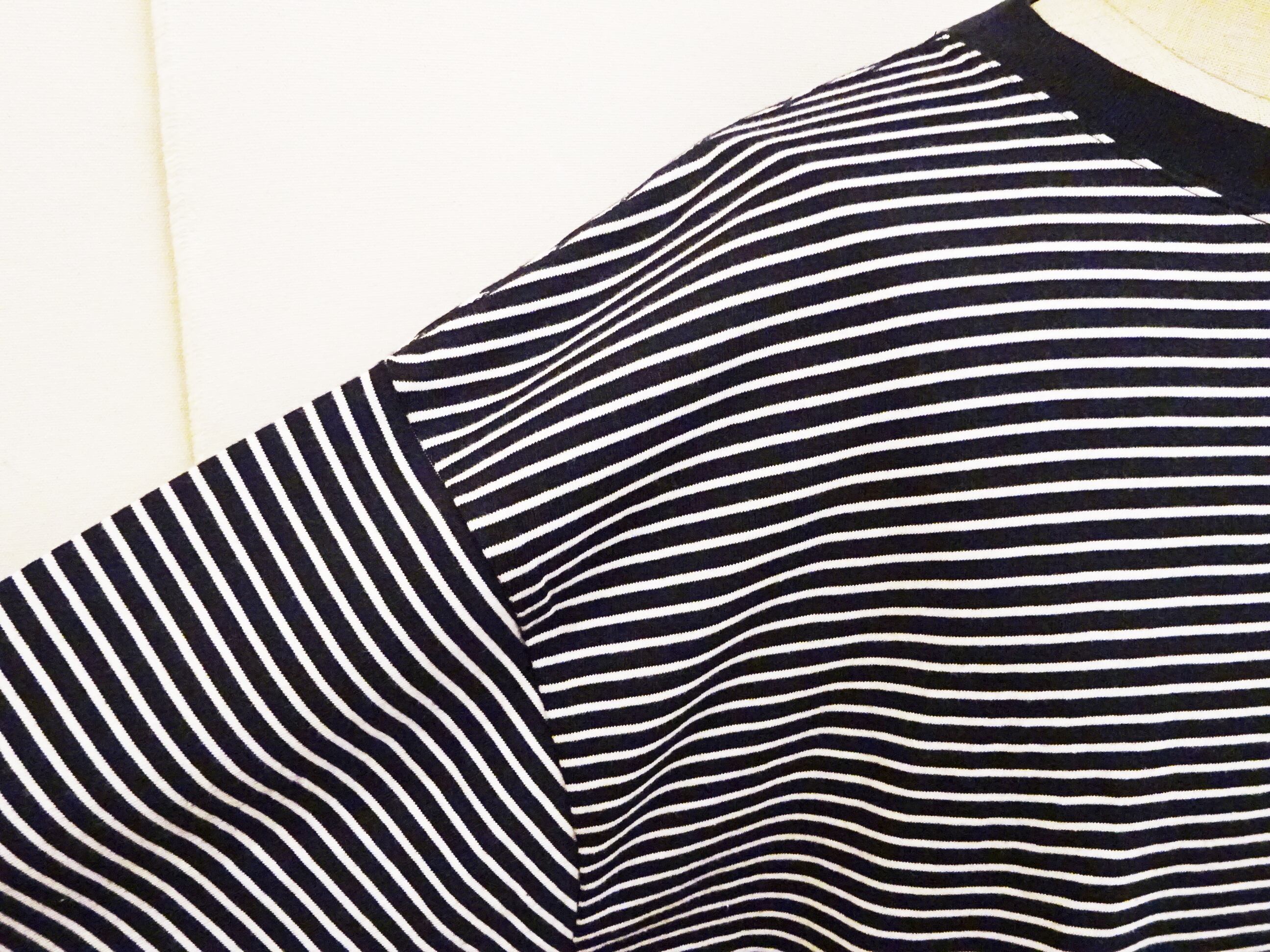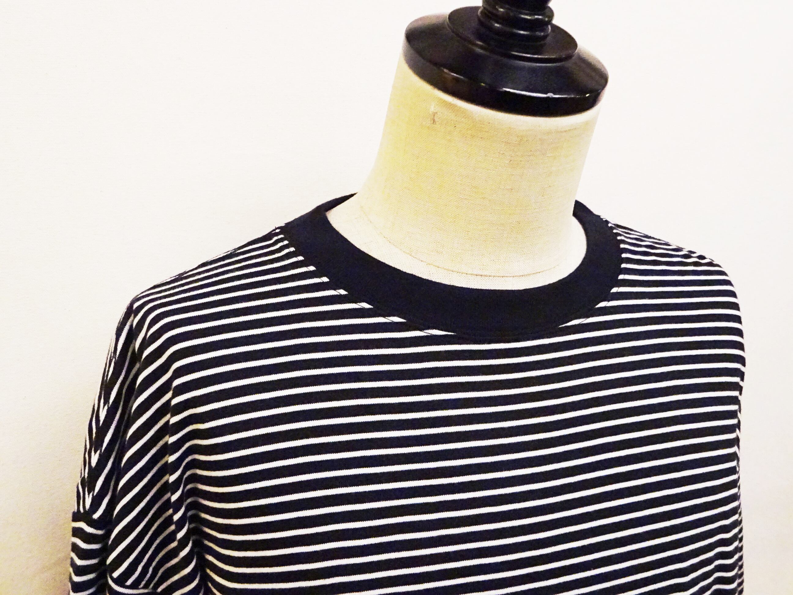 細ピッチのボーダー柄を採用し、ゆったりとしたオーバーサイズフィットでざっくりとイマの気分で着用が楽しめるサイズ感。吸汗性や速乾性が良く、サラッと軽い着心地と、シンプルなカラーリングはボトムスを選ばず出番の多いアイテムです。