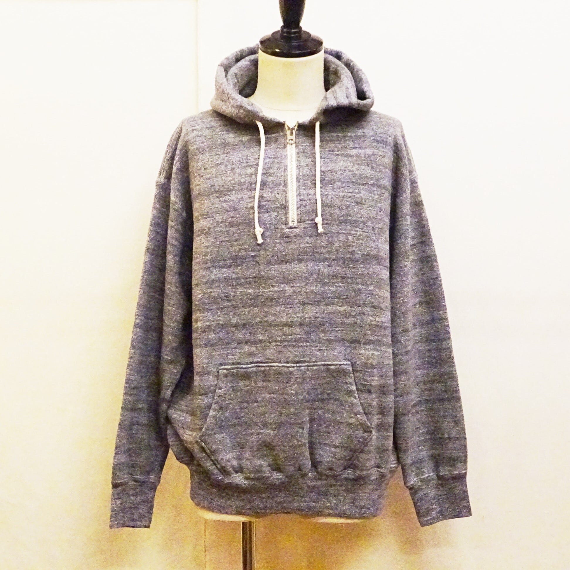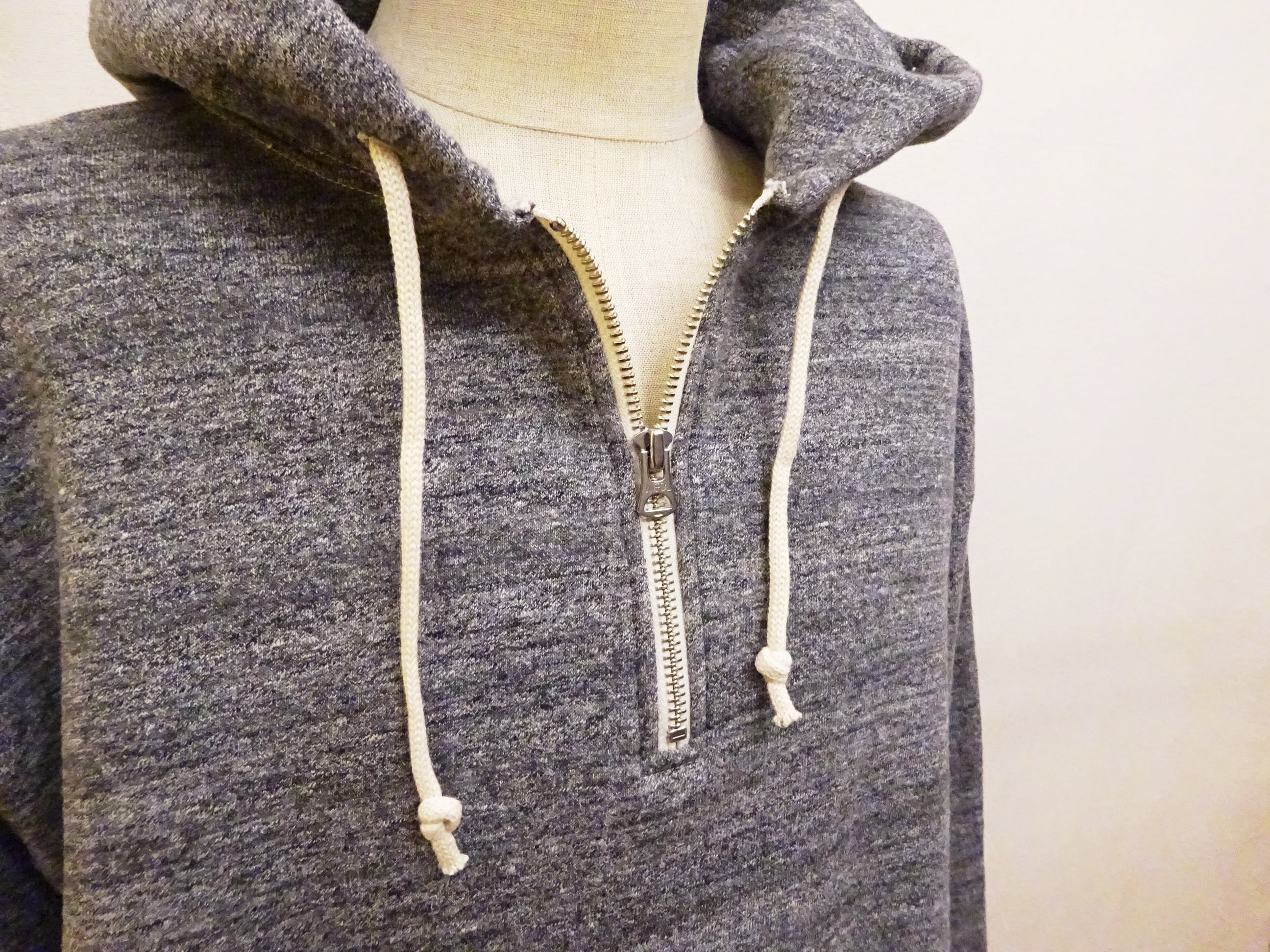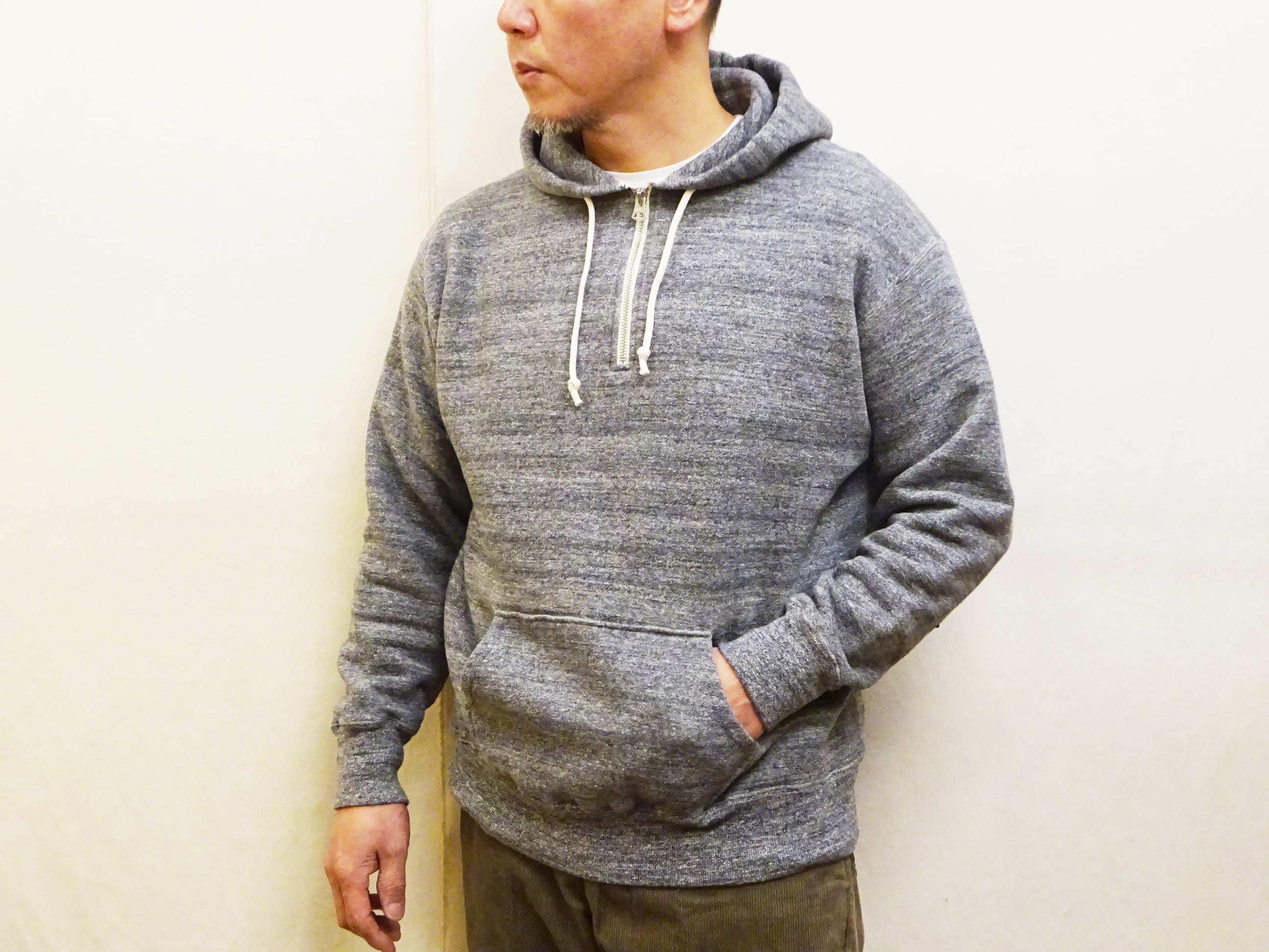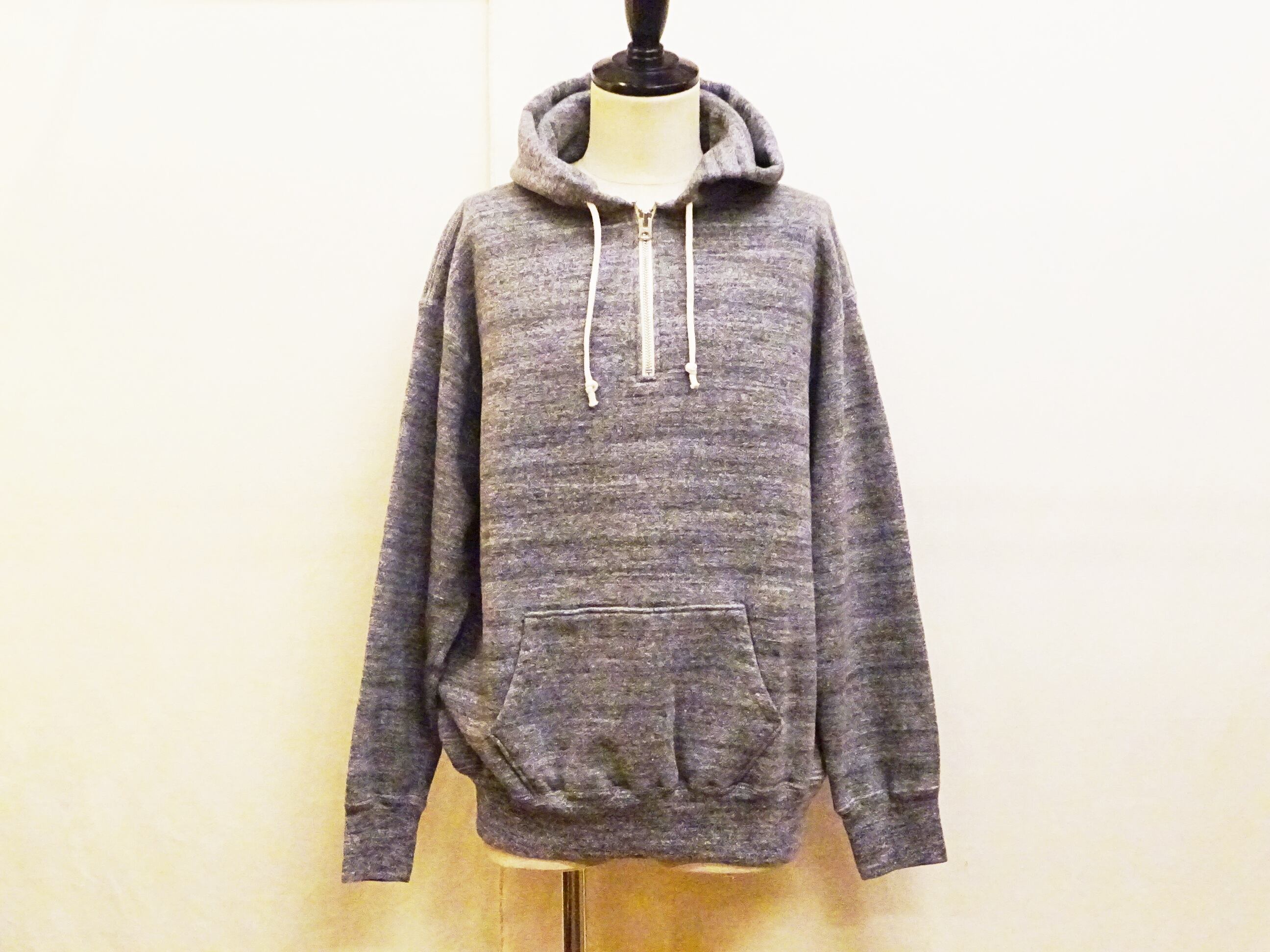 ヴィンテージスウェットの中でも逸品のハーフジップフーディ。ヴィンテージ感のある短丈、適度な太さのアーム設定でインナーにも使いやすい丸みのあるシルエットに仕上げられております。