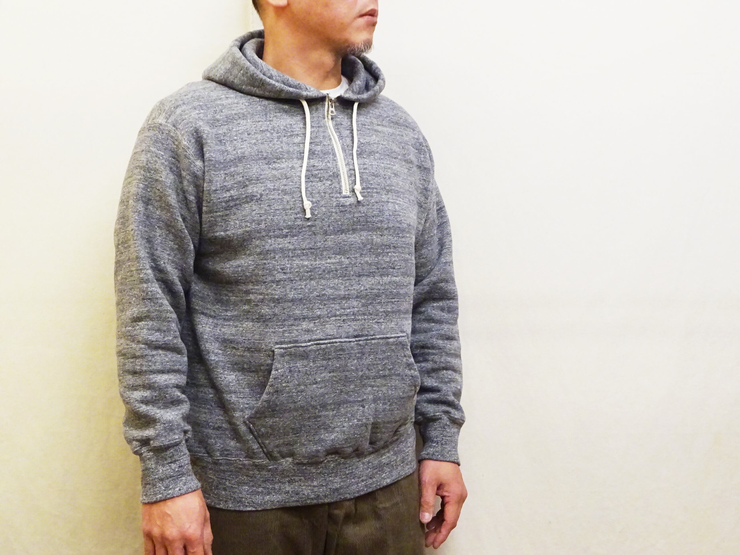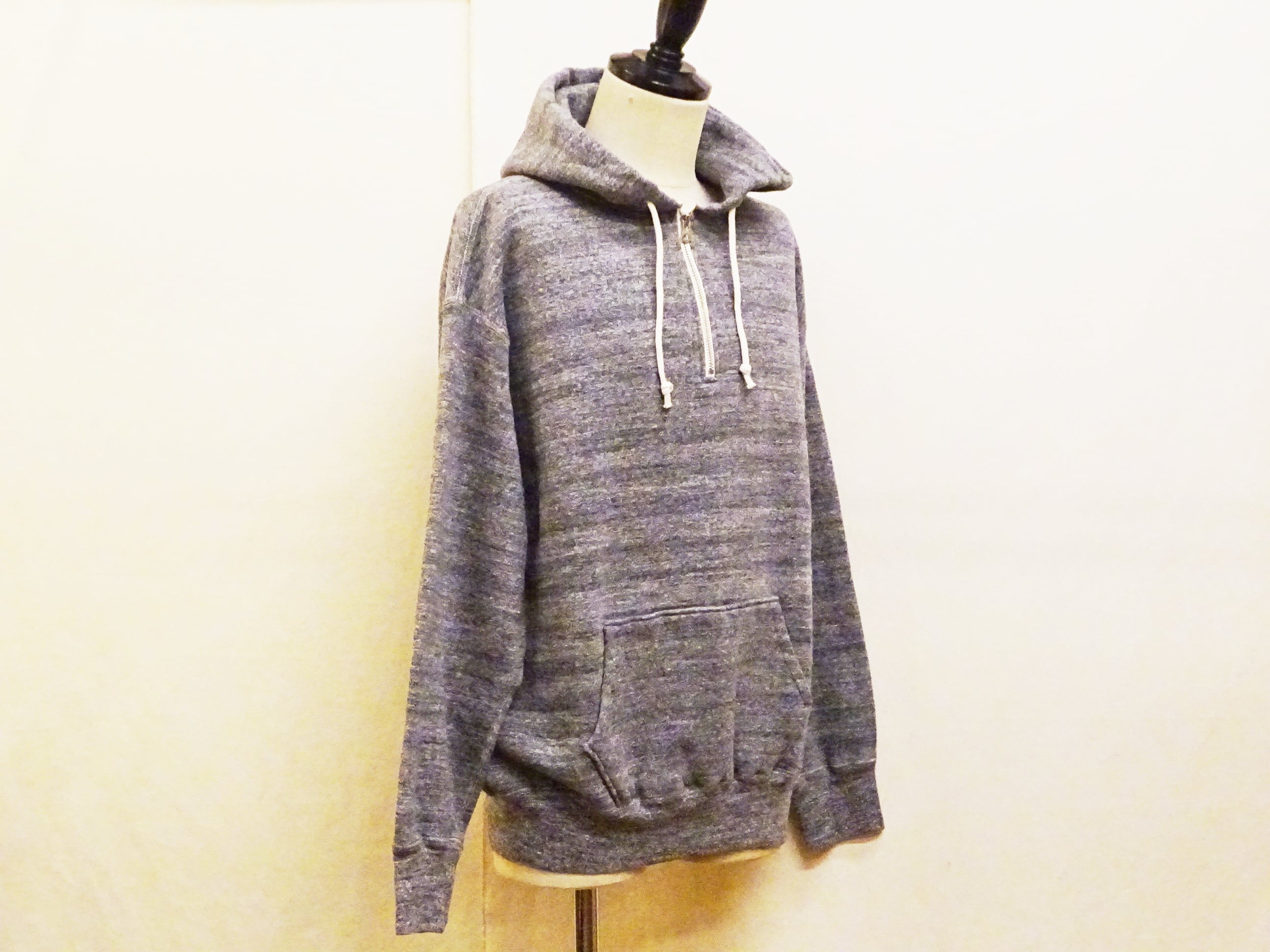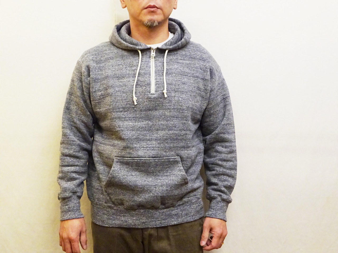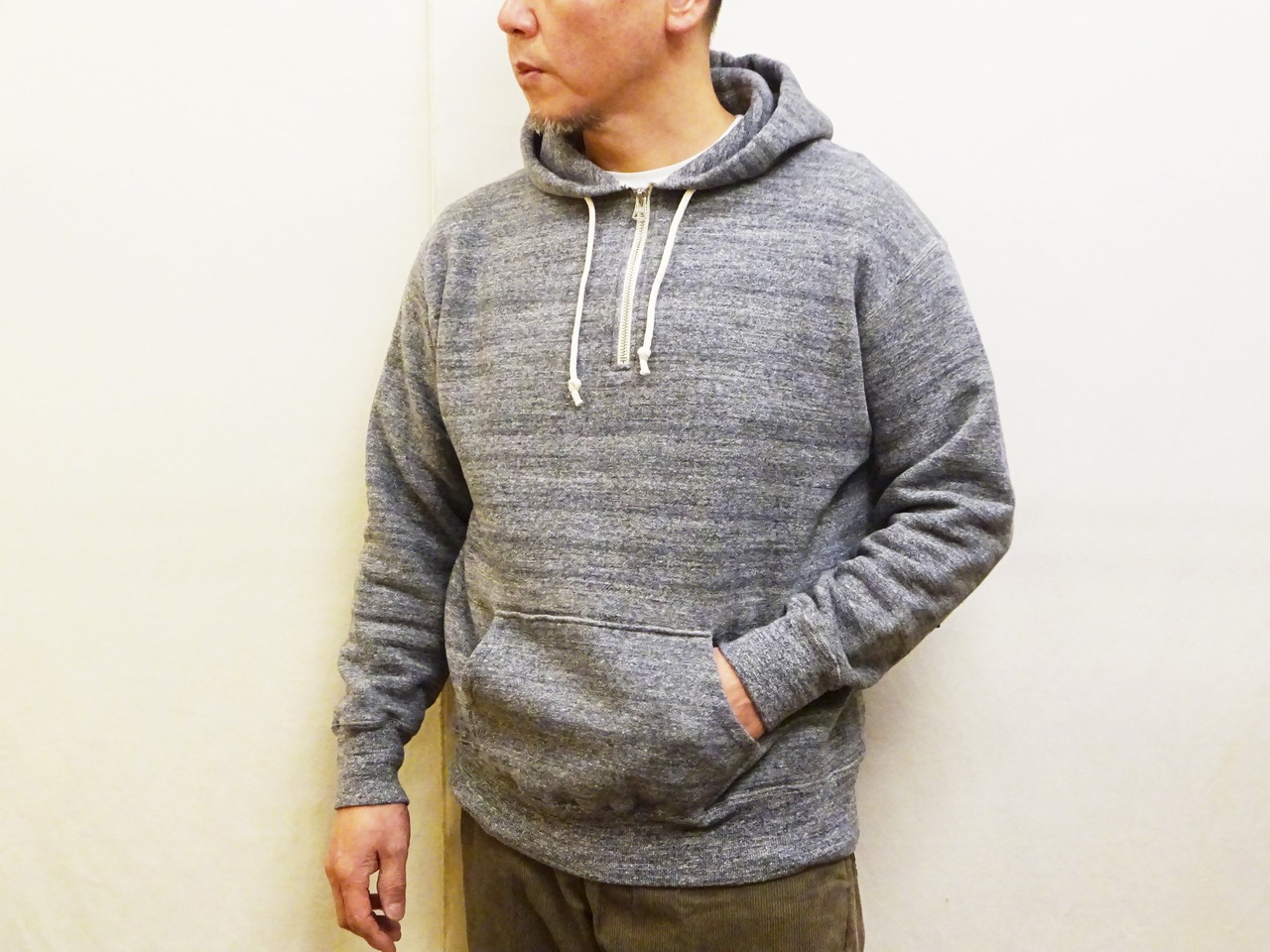 ヴィンテージスウェットの中でも逸品のハーフジップフーディ。ヴィンテージ感のある短丈、適度な太さのアーム設定でインナーにも使いやすい丸みのあるシルエットに仕上げられております。